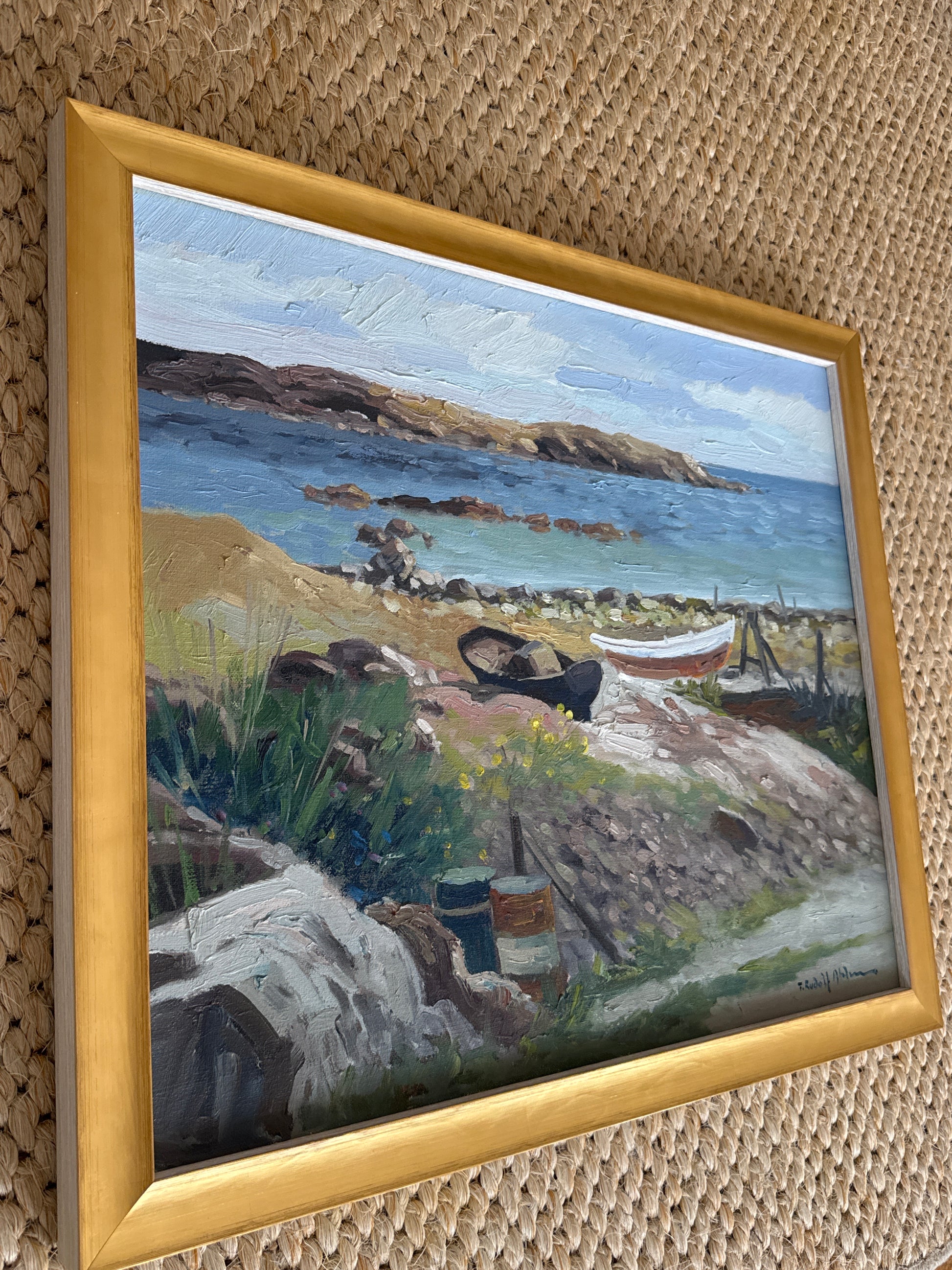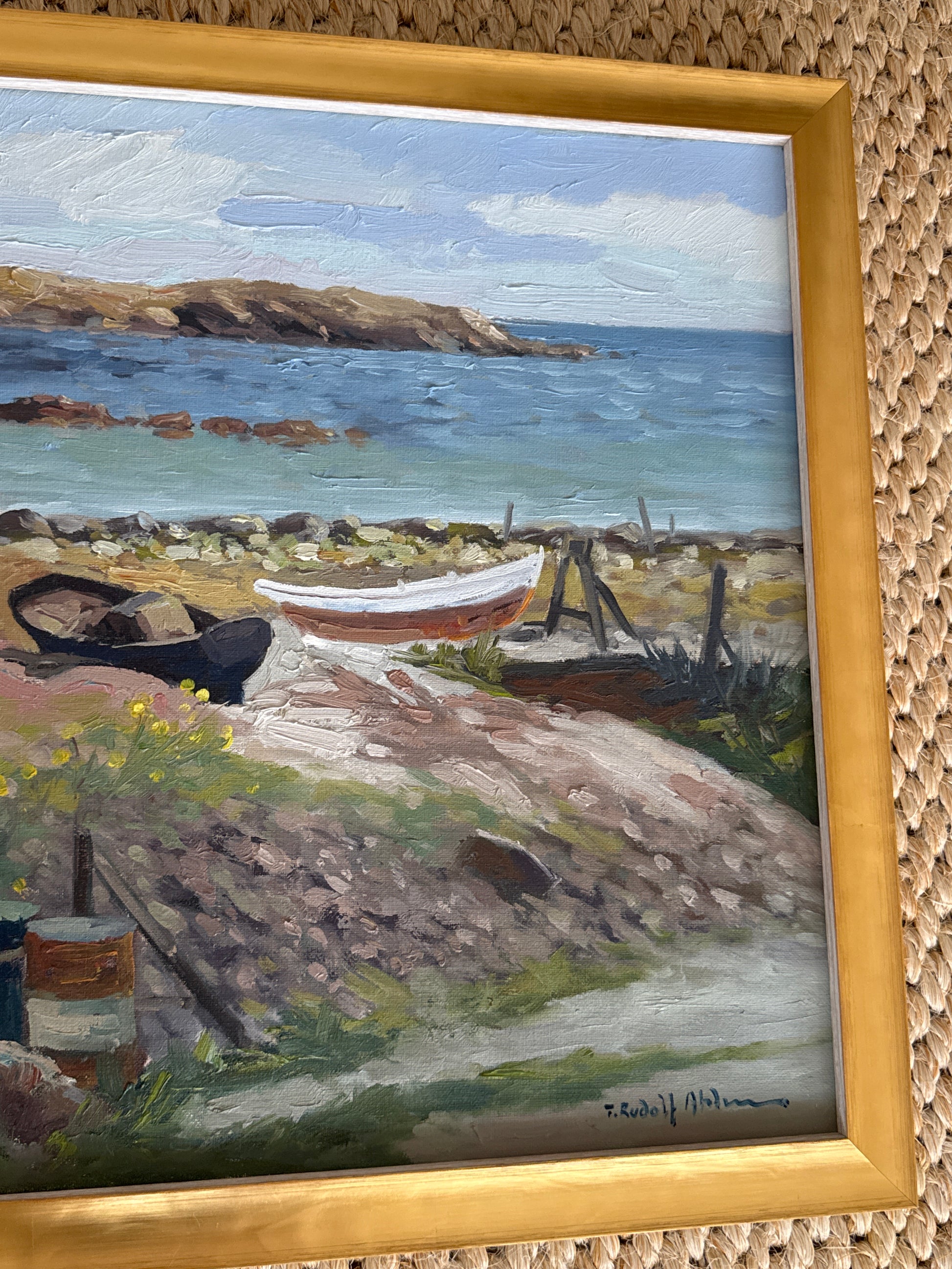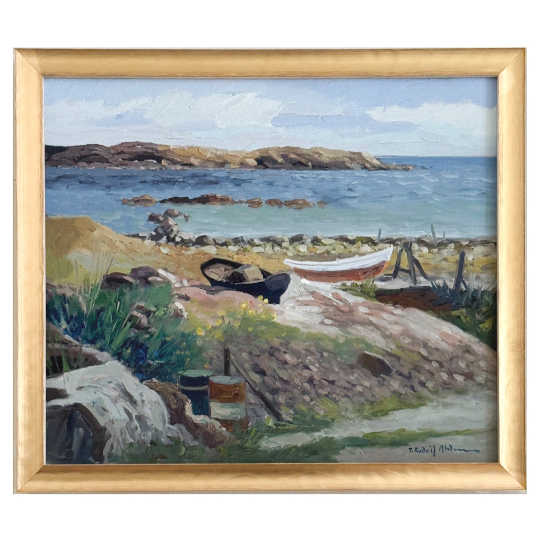 An original vintage oil painting on canvas from Denmark. Excellent vintage condition and newly framed in a pale gold frame with a white outer edge. Measures 20 x 23 inches including the frame.