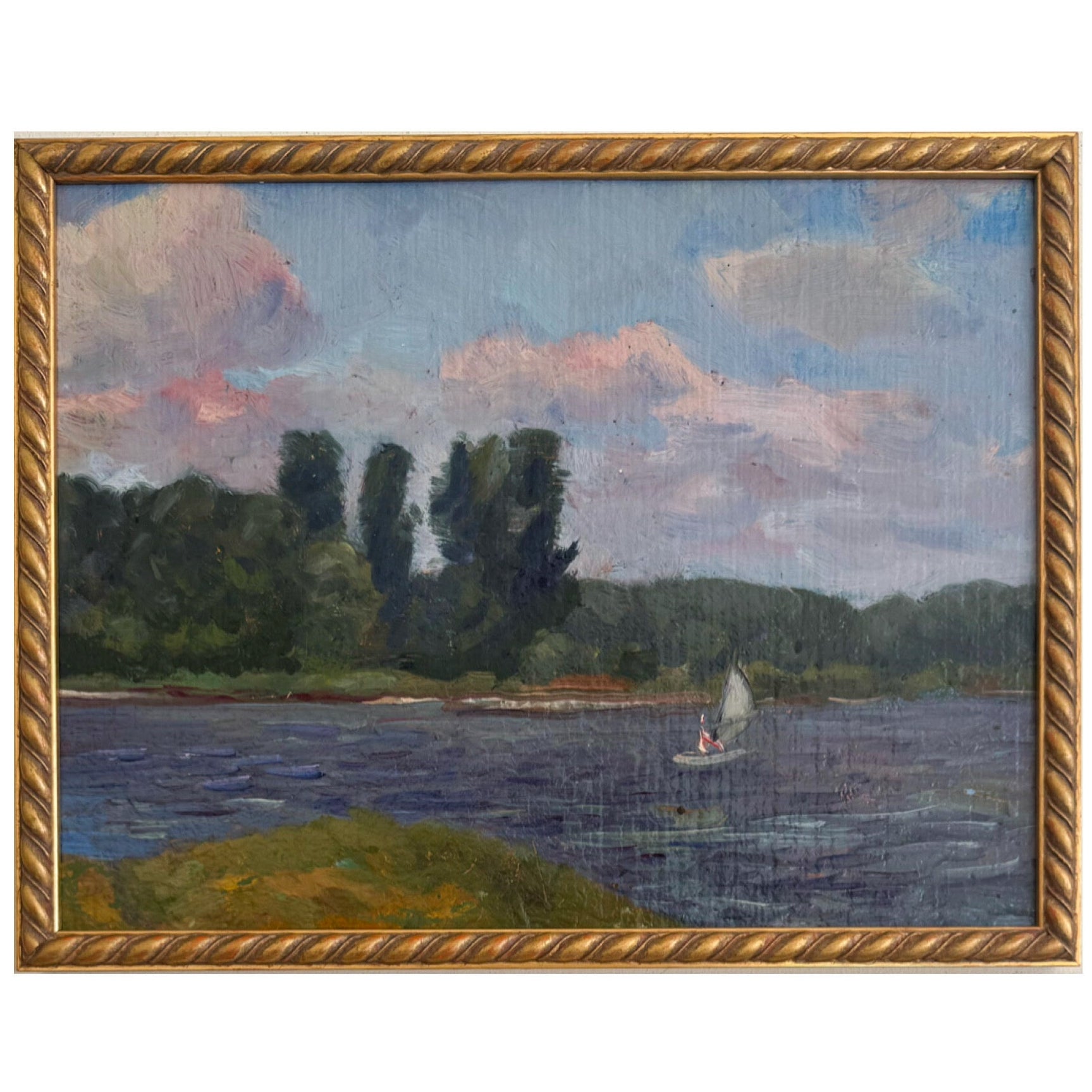 An original vintage oil painting from the 1970s. Very good vintage condition with some light patina. Narrow gold ornate frame. Measures 12 x 15 inches including the frame.