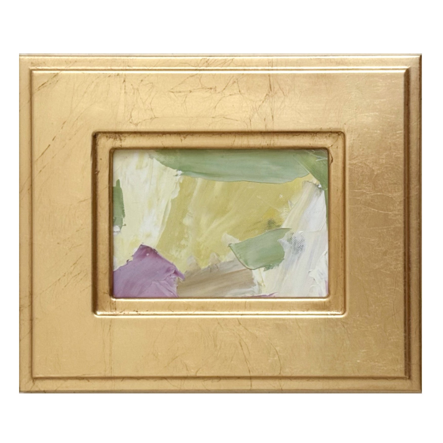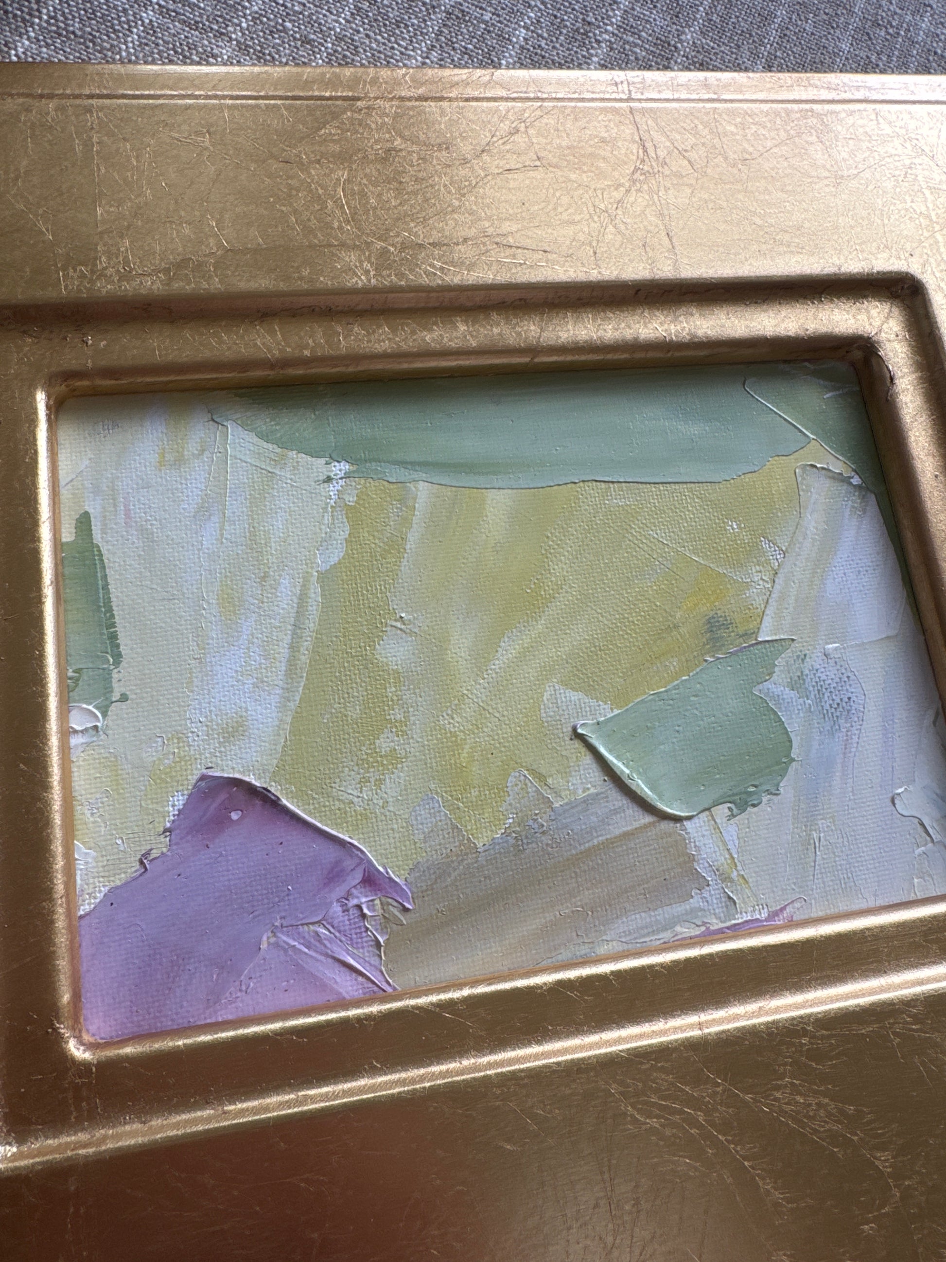 An original abstract oil painting on canvas by Vicki Bartley. Presented in a custom gold leaf frame. Measures 10 x 12 inches including the frame.