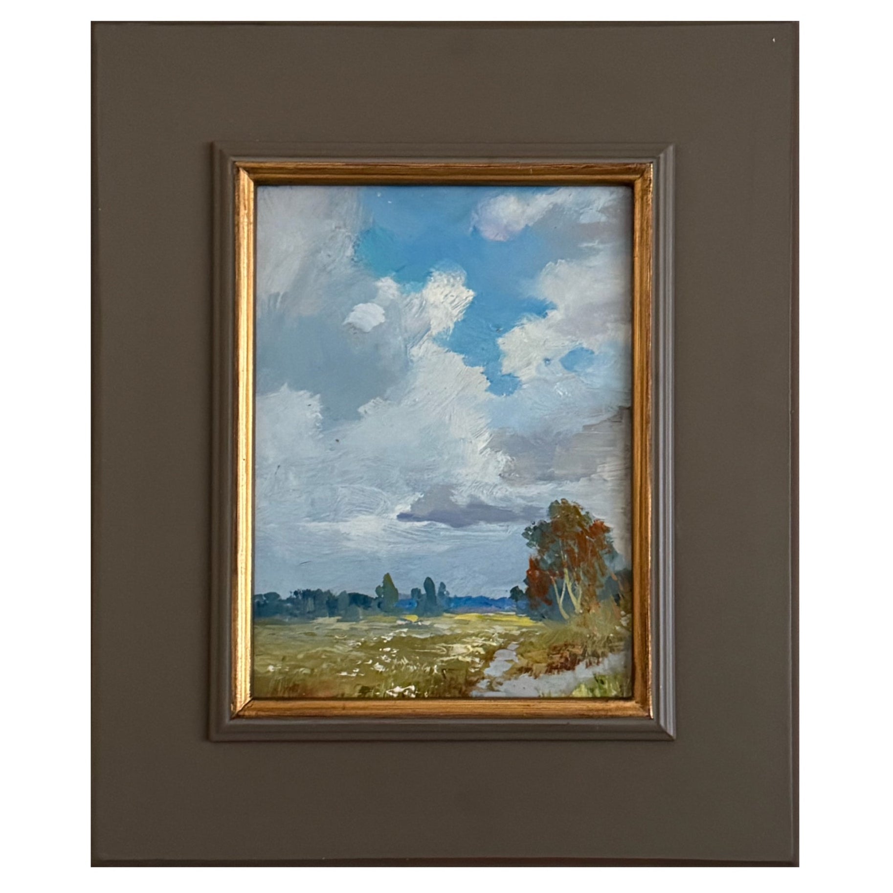 Measures 10.5 x 12.5 inches including the frame. An original oil painting on panel. Dates to the 1970s. Excellent vintage condition and newly framed in a warm gray frame with a gold inner bevel.