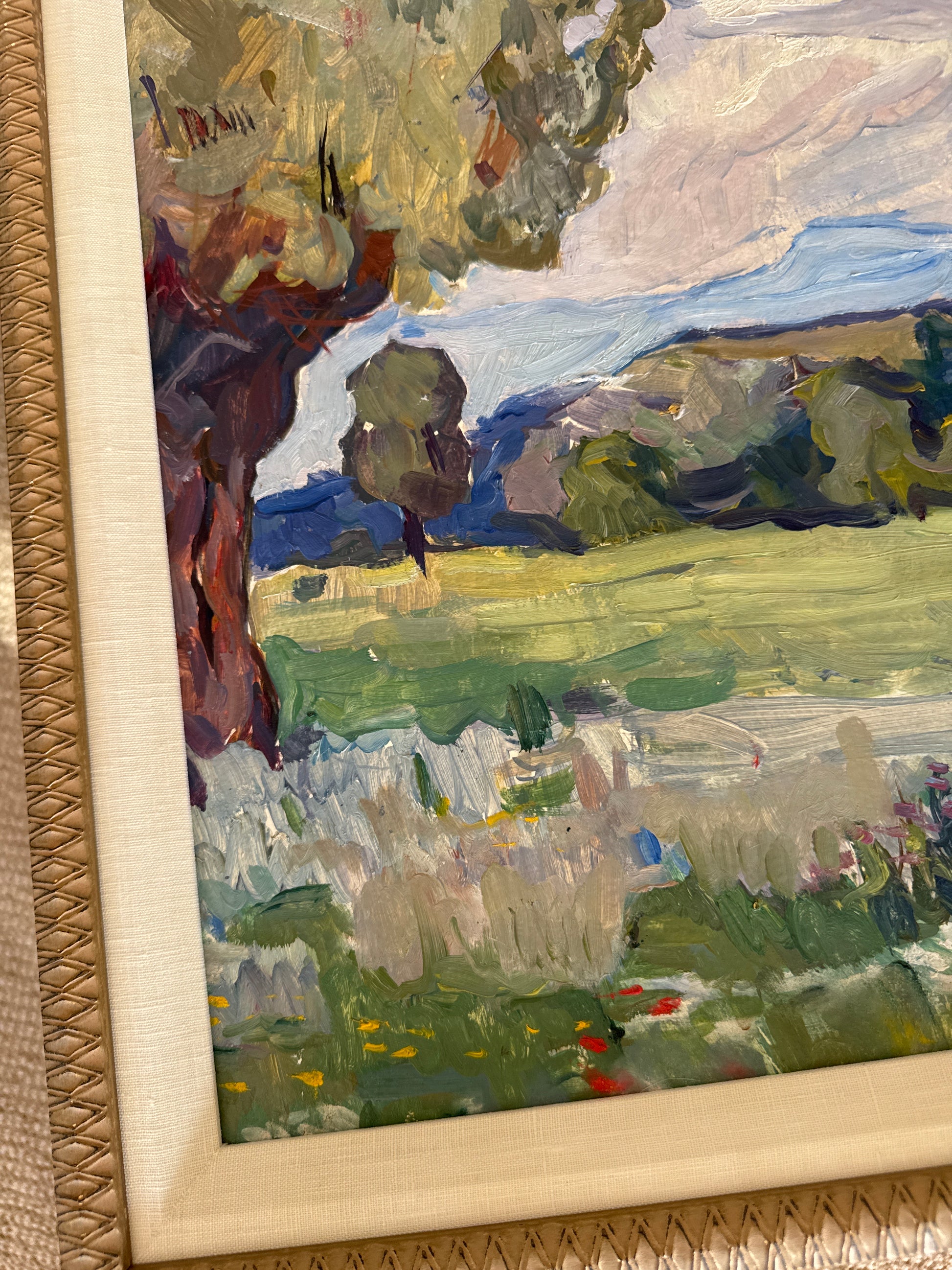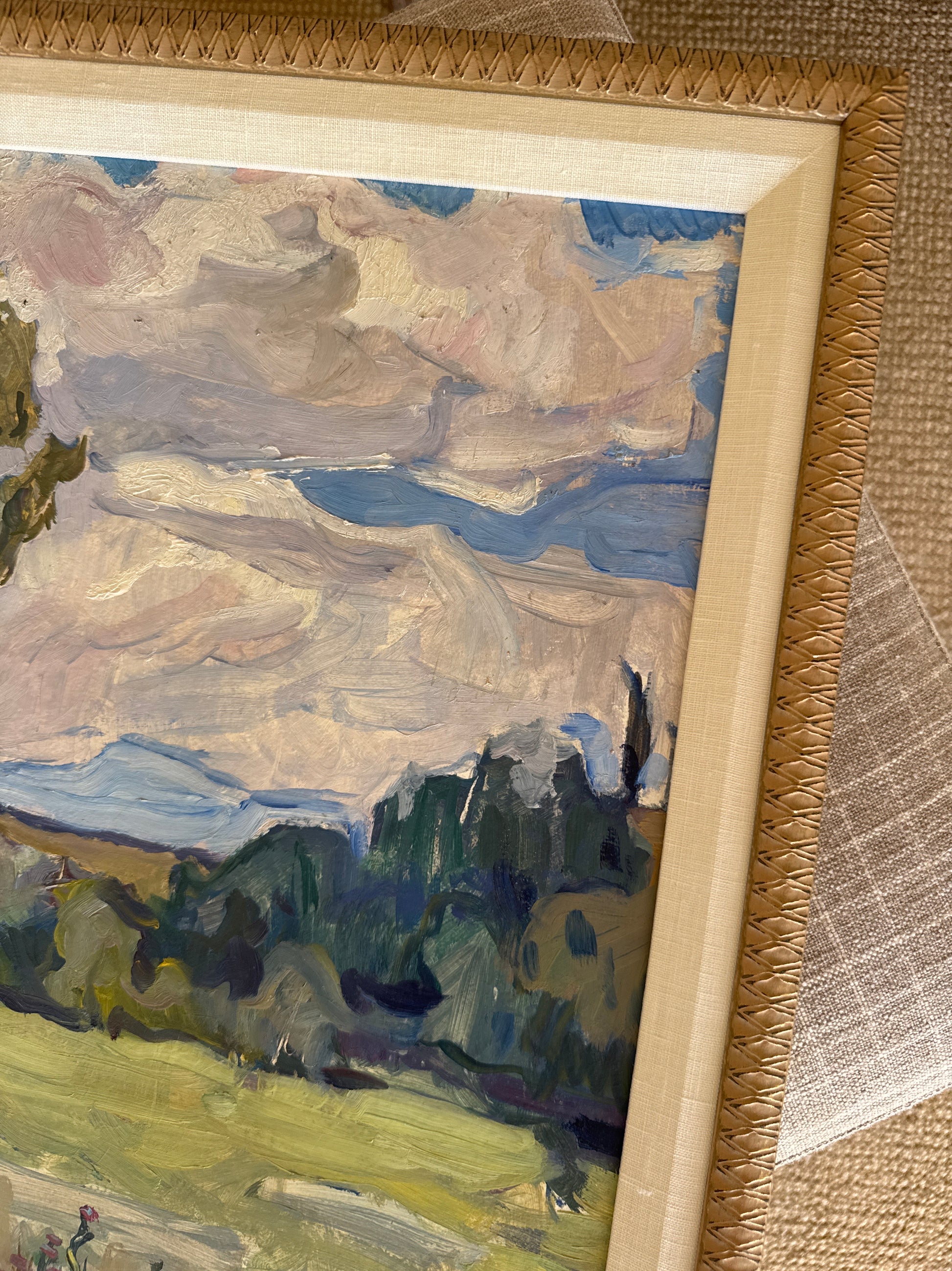 An original vintage oil painting on board. Excellent vintage condition from the 1950s. Signed on the reverse. Newly framed with a linen liner. Measures 20 x 22 inches including the frame.