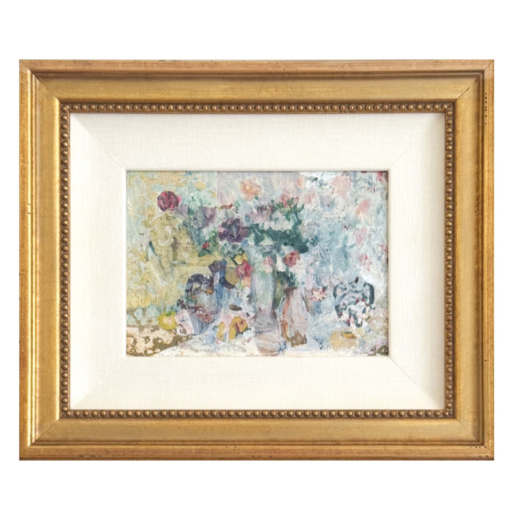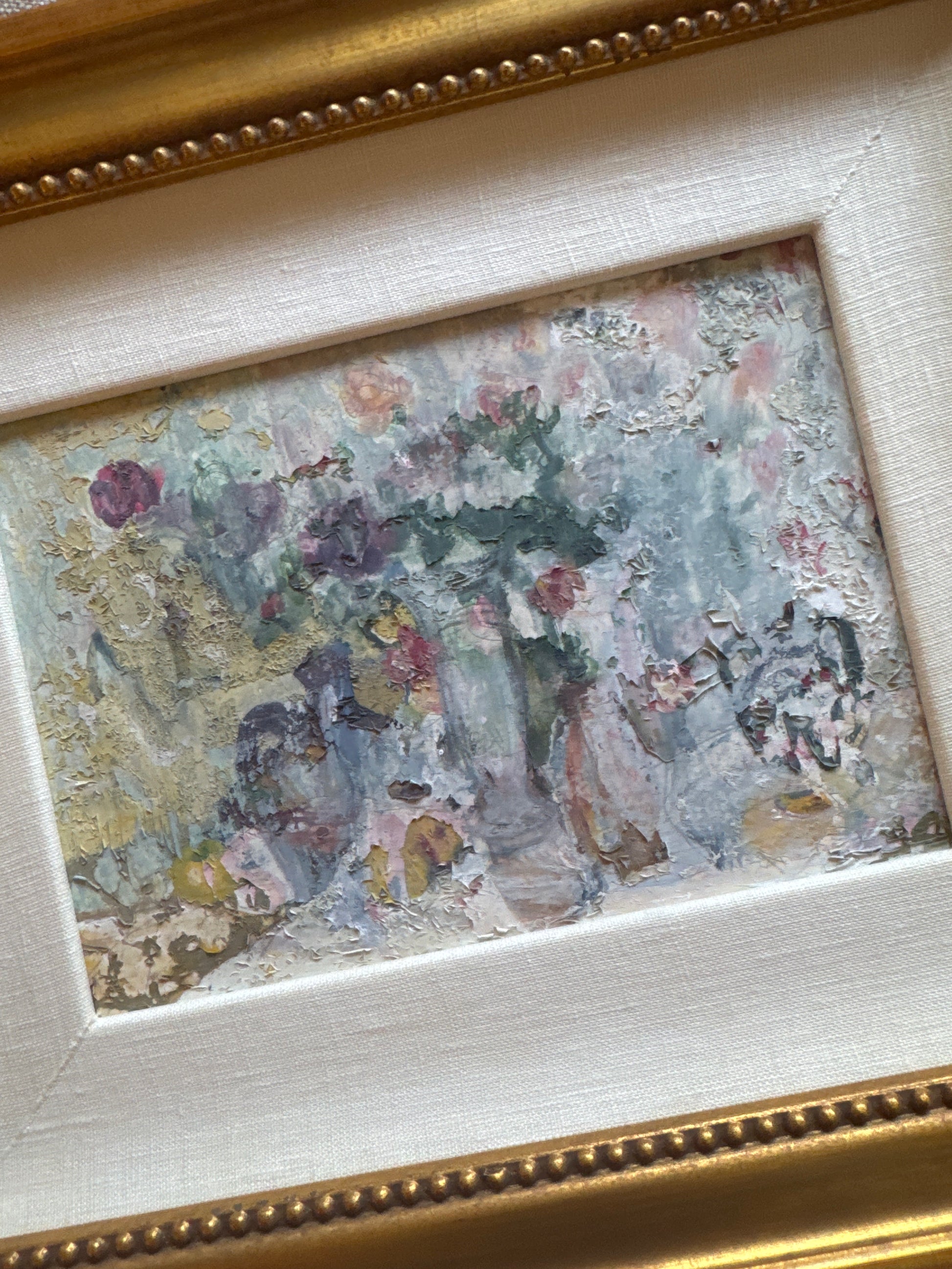 An original antique oil painting on panel. This piece has extensive patina that adds to its charm. Frame and wide linen liner are new. Measures 12 x 14 inches including the frame.