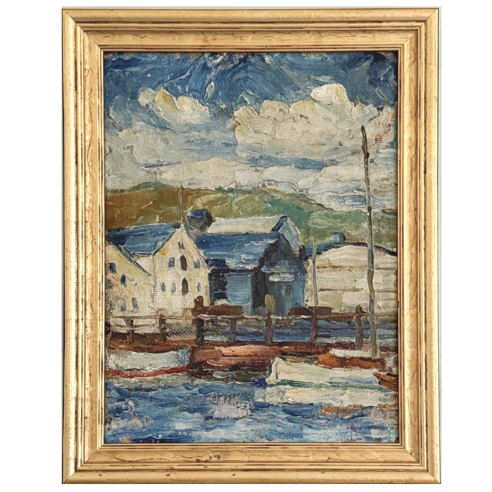 Measures 15 x 18 inches including the frame. An original vintage oil painting on canvas. Excellent condition and newly framed in an antiqued gold leaf frame with a black outer edge.
