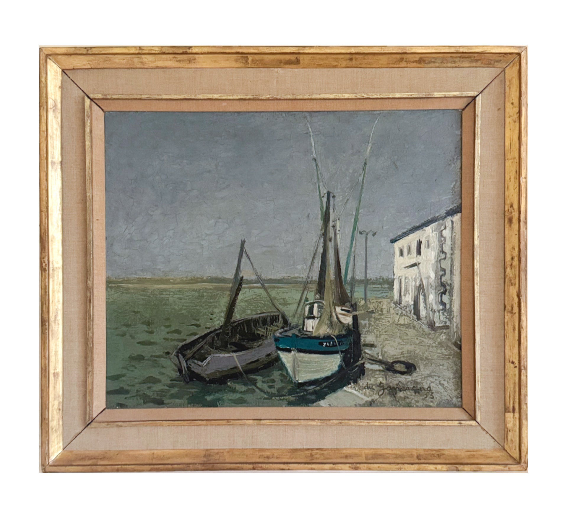 A large, original, vintage oil painting from France. Signed and dated in the lower right, and signed in the reverse on the wooden stretchers. Frame is also original. Gold leaf and natural linen. Measures 25 x 28 inches including the frame. Painting is in excellent condition, frame has some patina due to age. Looks exquisite with the painting!