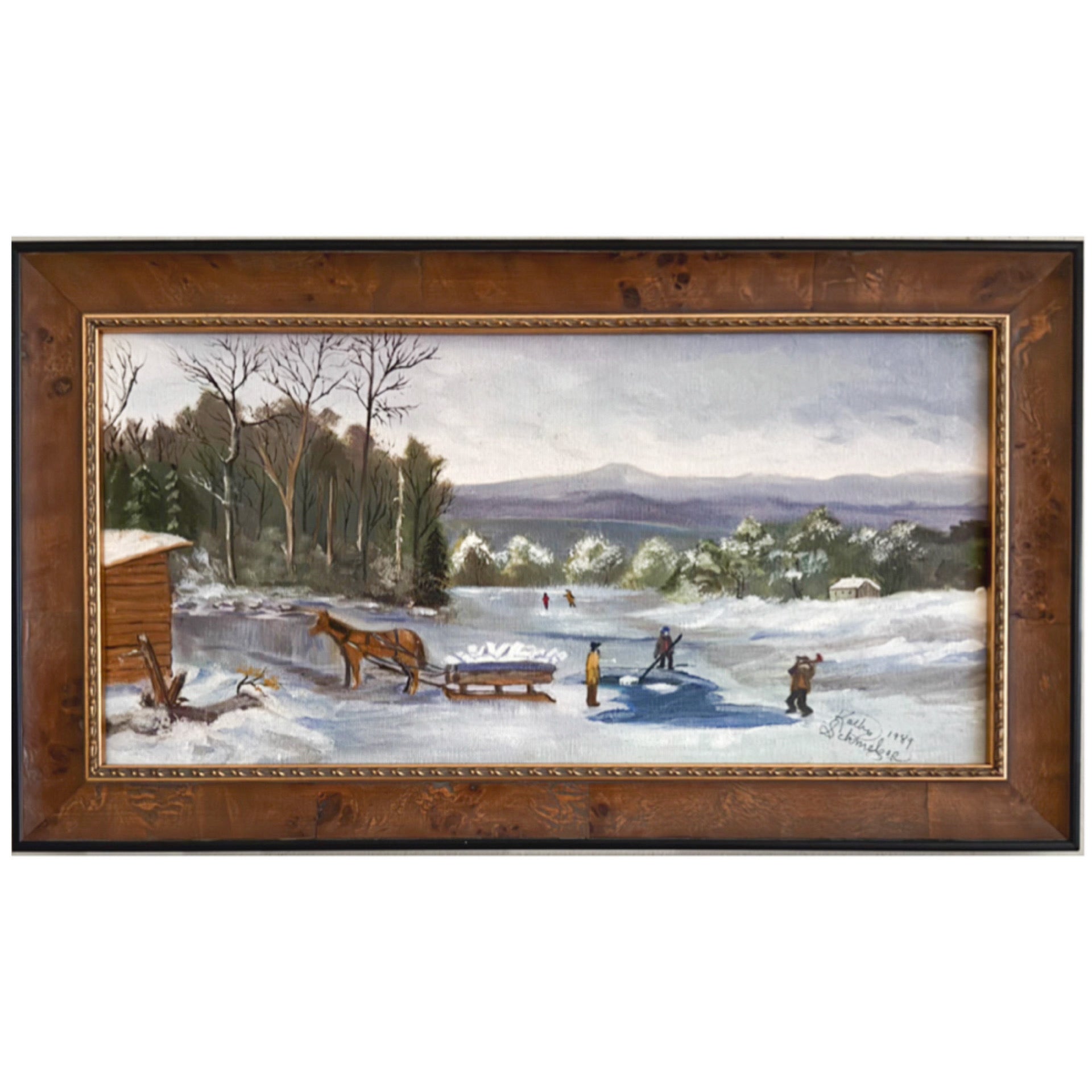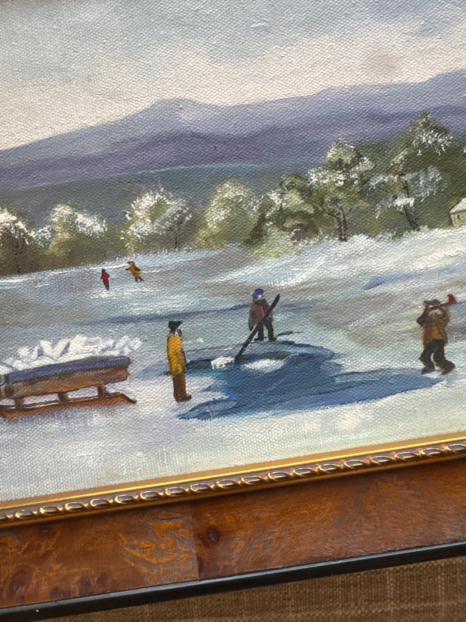 An original vintage oil painting on canvas. Excellent condition. Signed lower right. Newly framed in a burl wood frame with a gold inner bevel. Measures 10.5 x 18 inches including the frame.