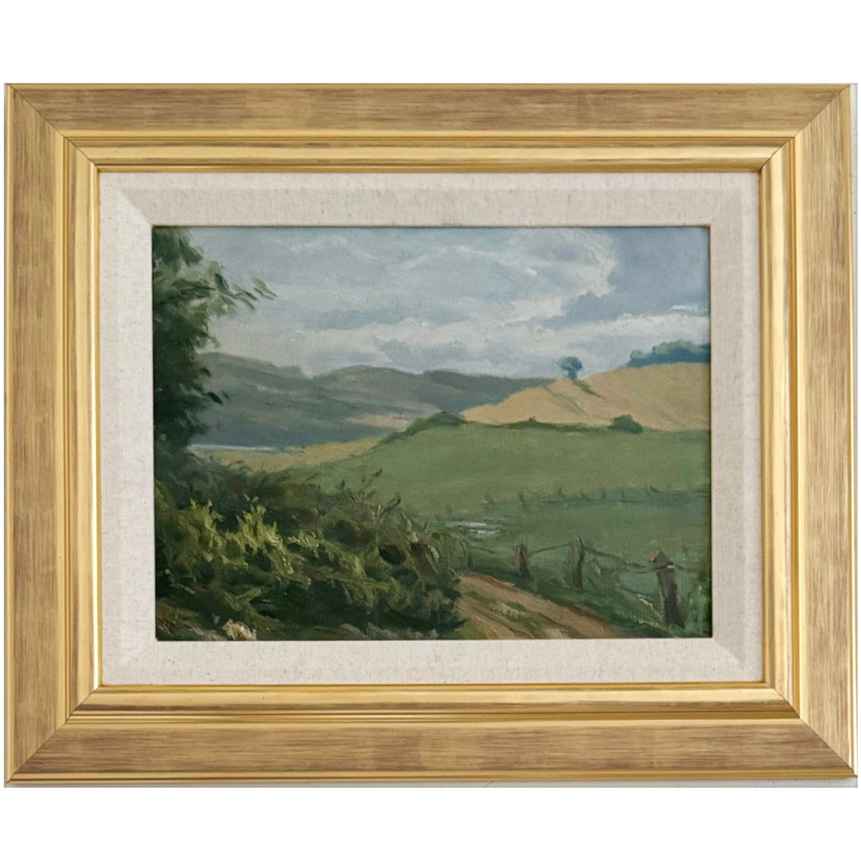 An original vintage oil painting on canvas from the 1950s. Excellent condition and newly framed with a linen liner and pale gold frame. Measures 14.5 x 17.5 inches including the frame.