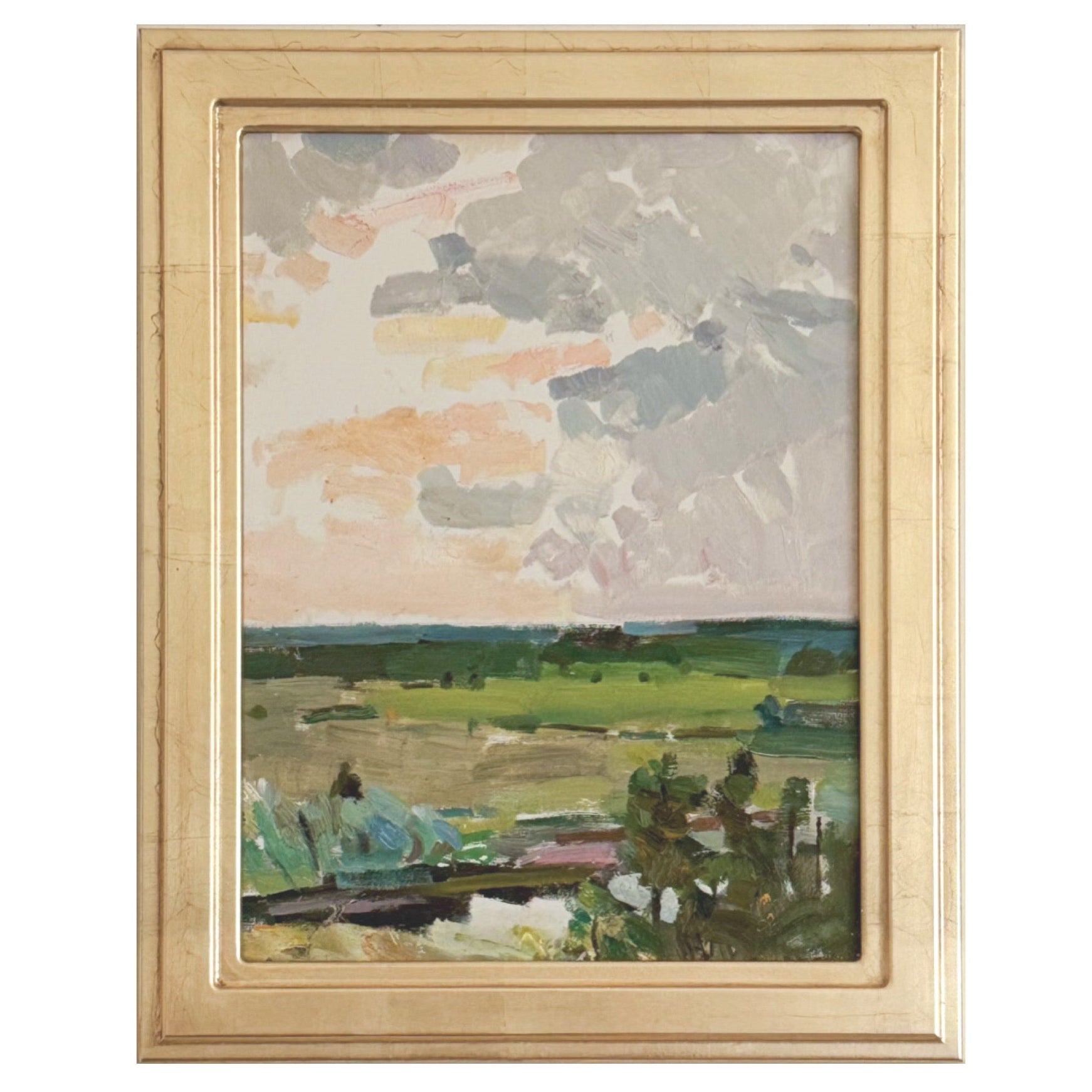 An original vintage oil painting on board. Excellent vintage condition and newly framed in a custom gold leaf frame. Measures 15 x 19 inches including the frame.