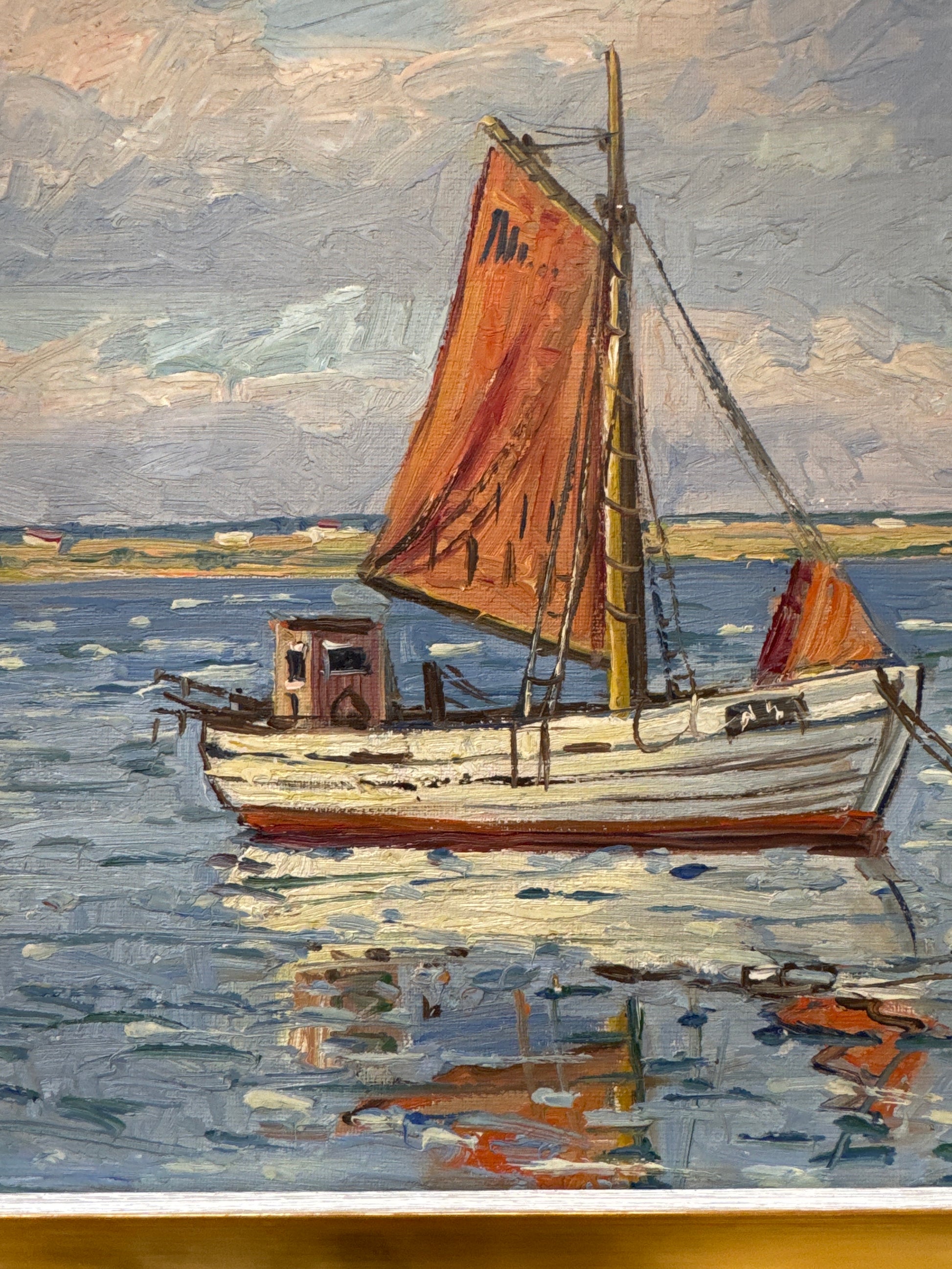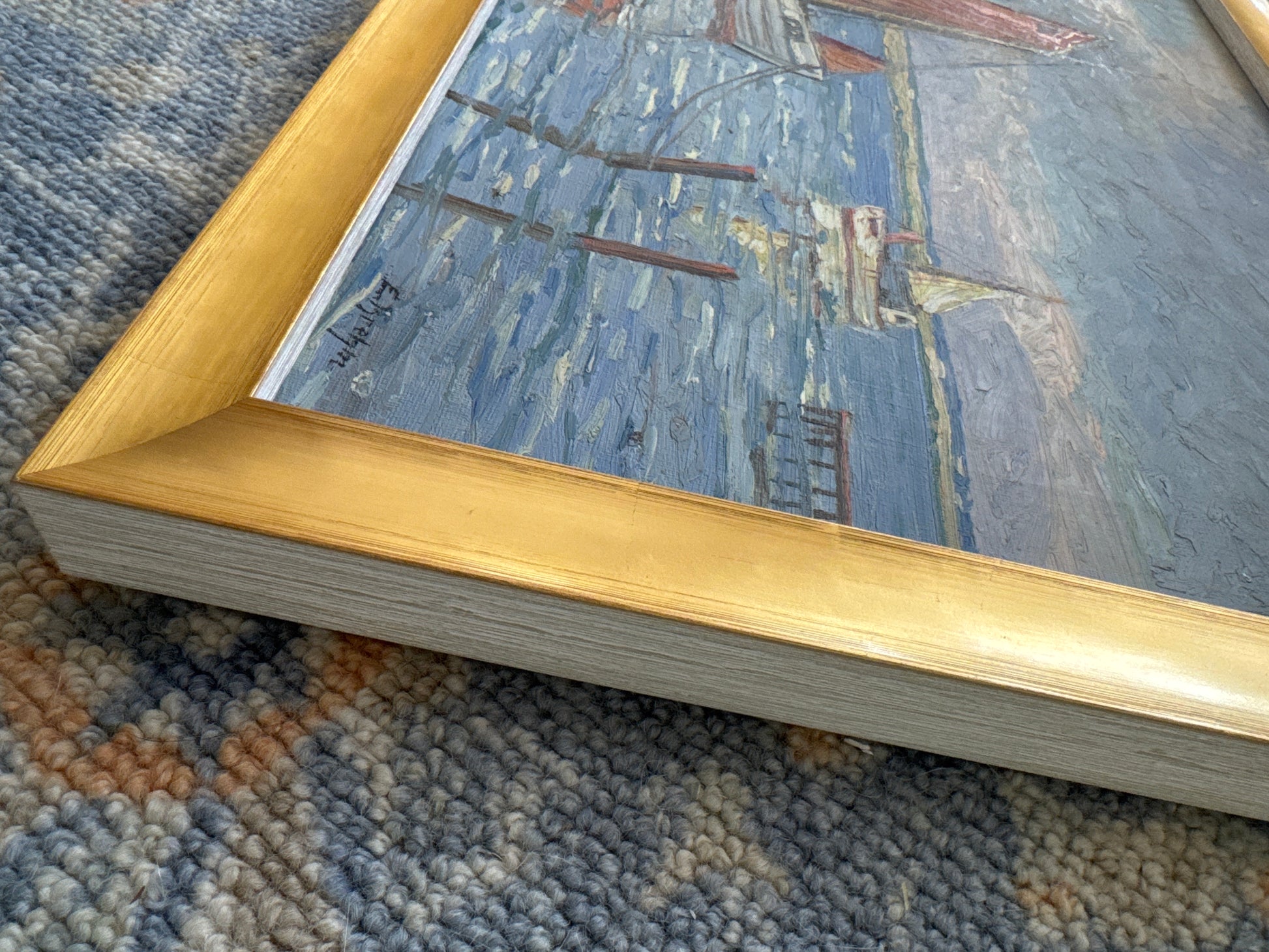 An original vintage oil painting on canvas. Excellent condition and signed in the lower right. Newly framed in a pale gold frame with a white outer edge. Measures 15.5 x 21.5 inches including the frame.