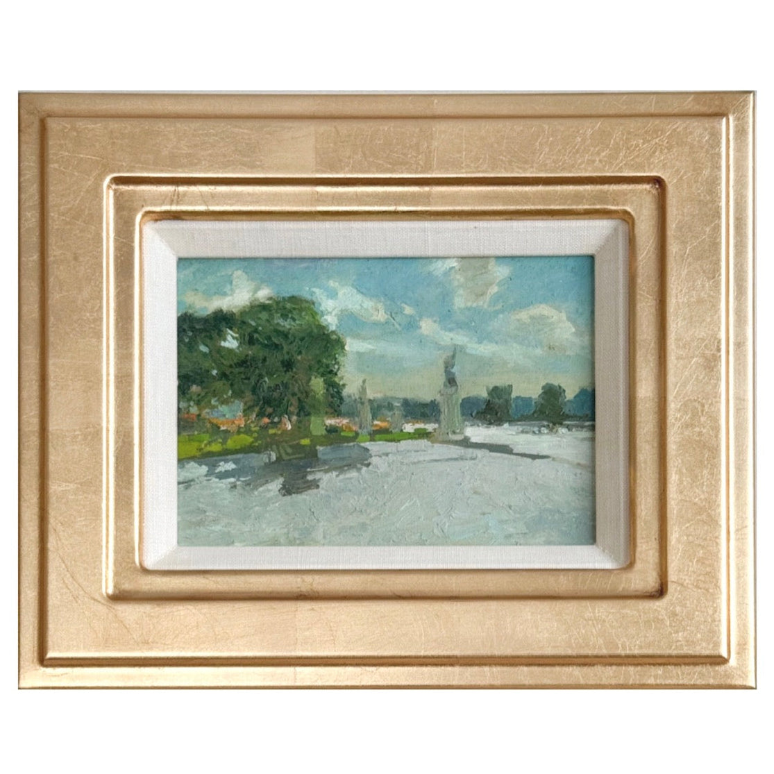 Measures 9 x 11 inches including the frame. An original vintage oil painting on canvas. Newly framed in a gold leaf custom frame with a linen liner.