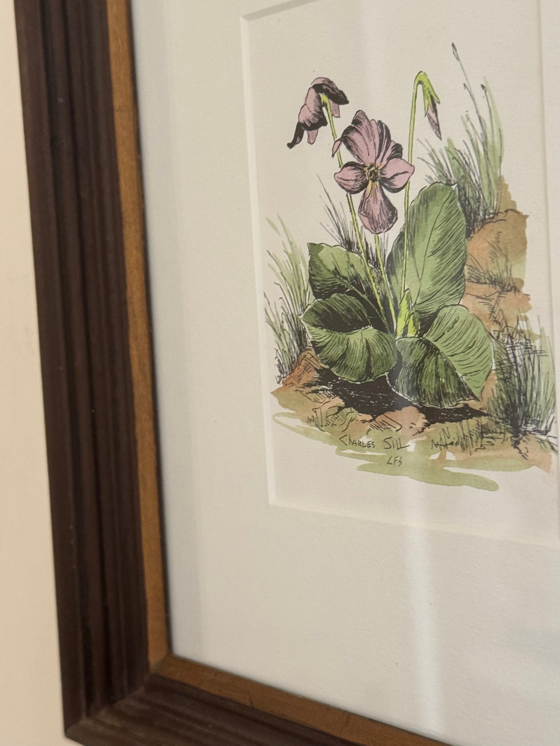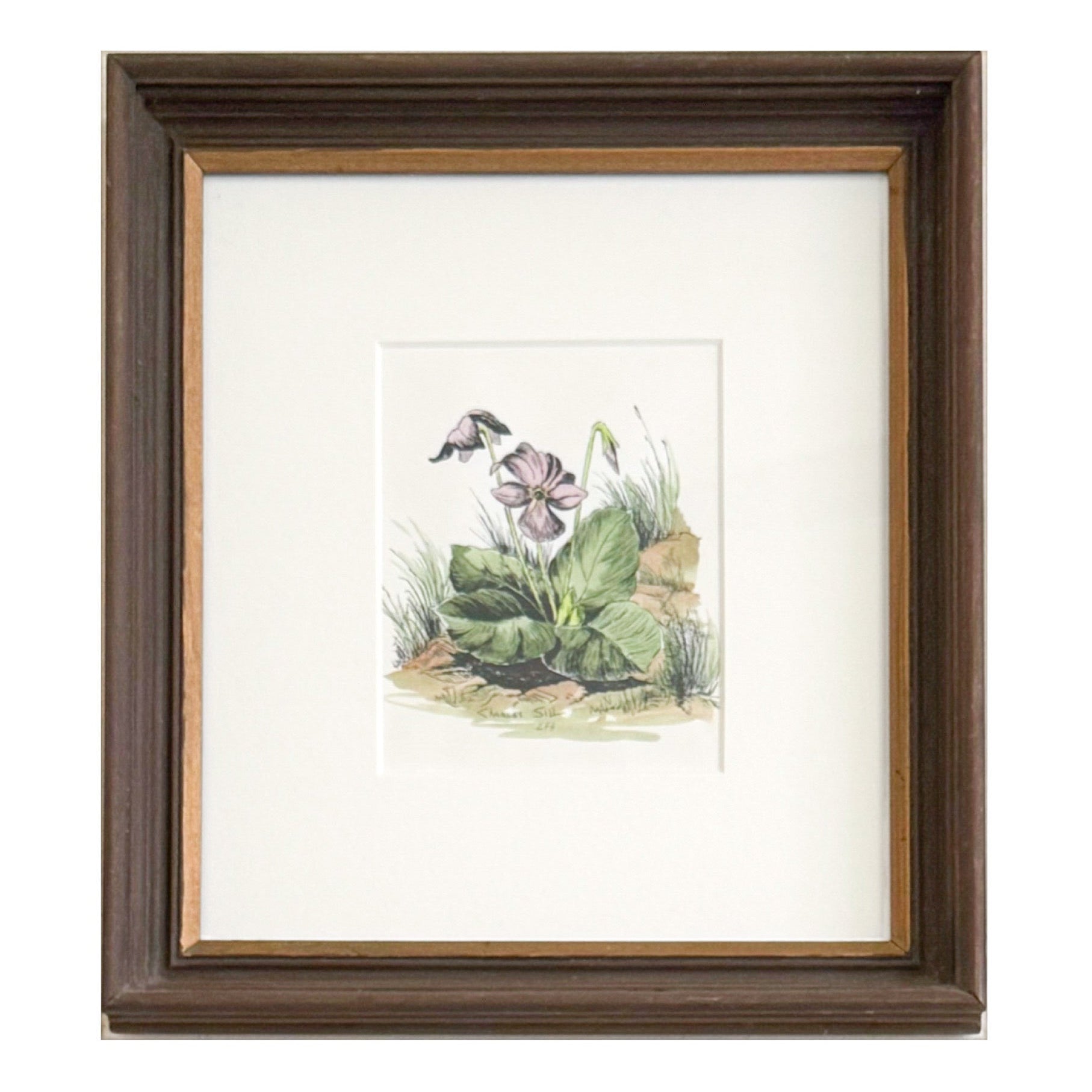 An original mixed media piece, signed in the lower left. Pen & ink with watercolor. Excellent vintage condition and newly framed & matted with UV protective glass. Frame is wood with a gold bevel. Measures 9.5 x 10.5 inches including the frame.