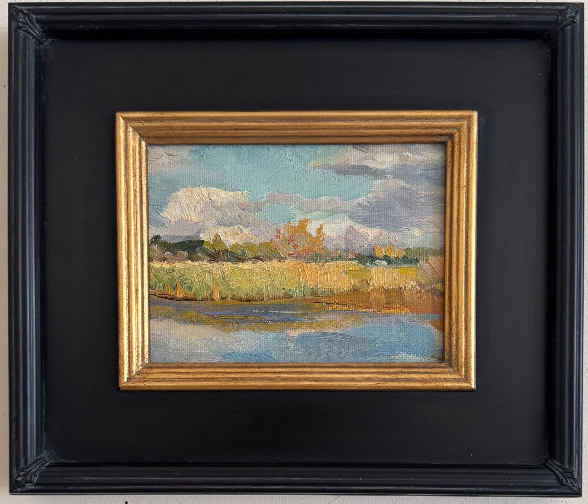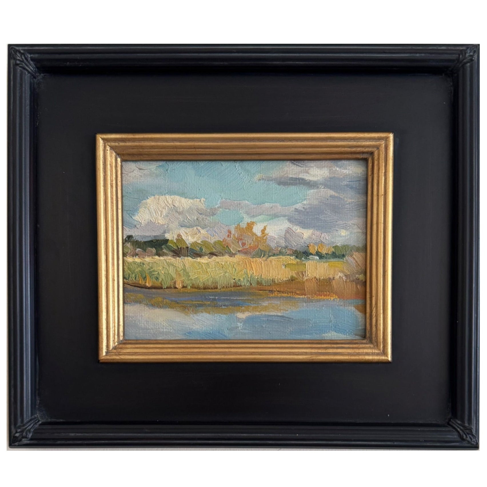 Le Marais (the marsh). An original vintage oil painting from France. Dates to the 1960s and found in excellent condition. Framed in a black frame with a gold inner bevel. Measures 12 x 14 inches including the frame.