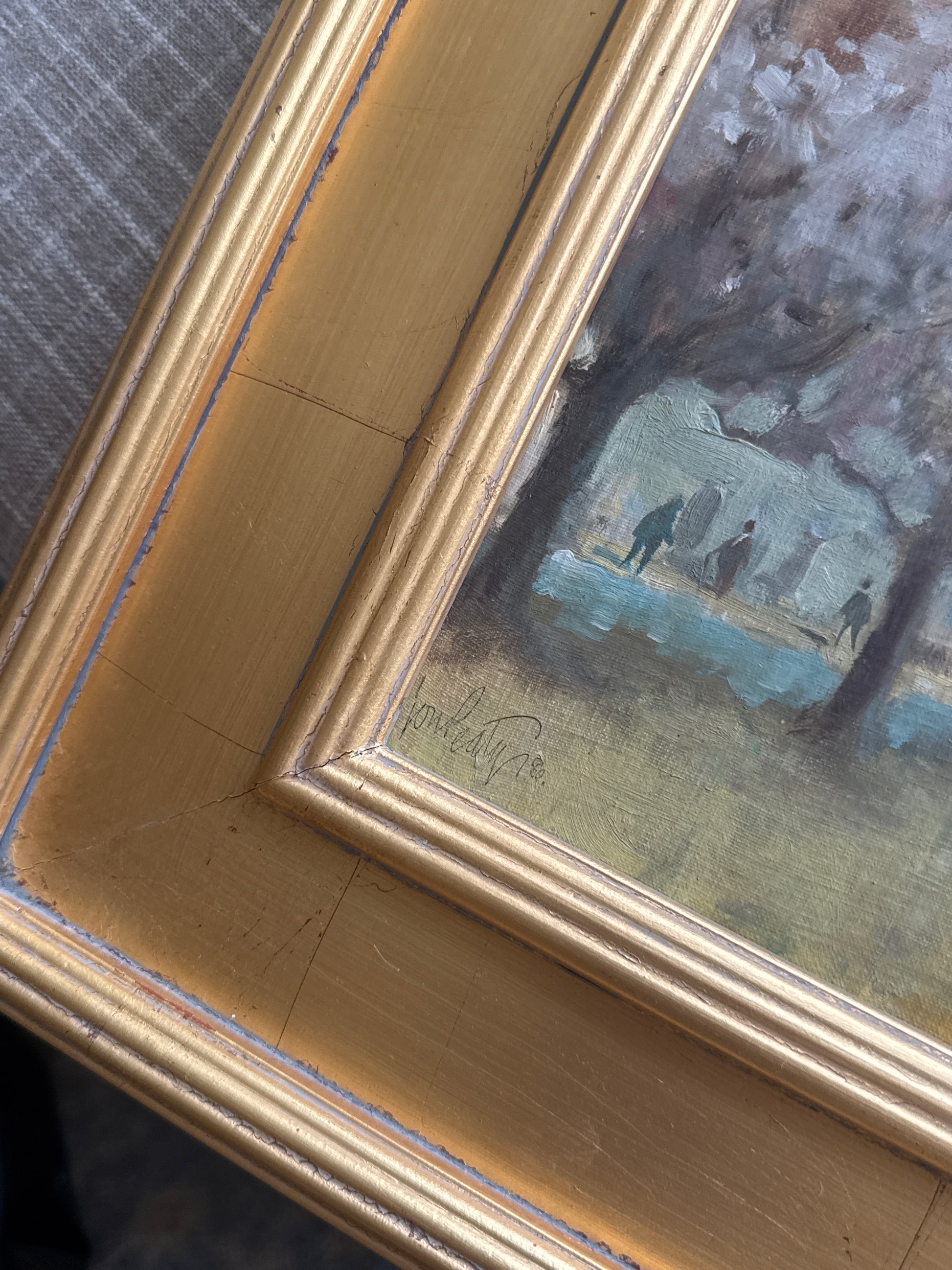 An original vintage oil painting from France. Signed in the lower left. Presented in a gold leaf plein air frame with corner details. Measures 15 x 17 inches including the frame.