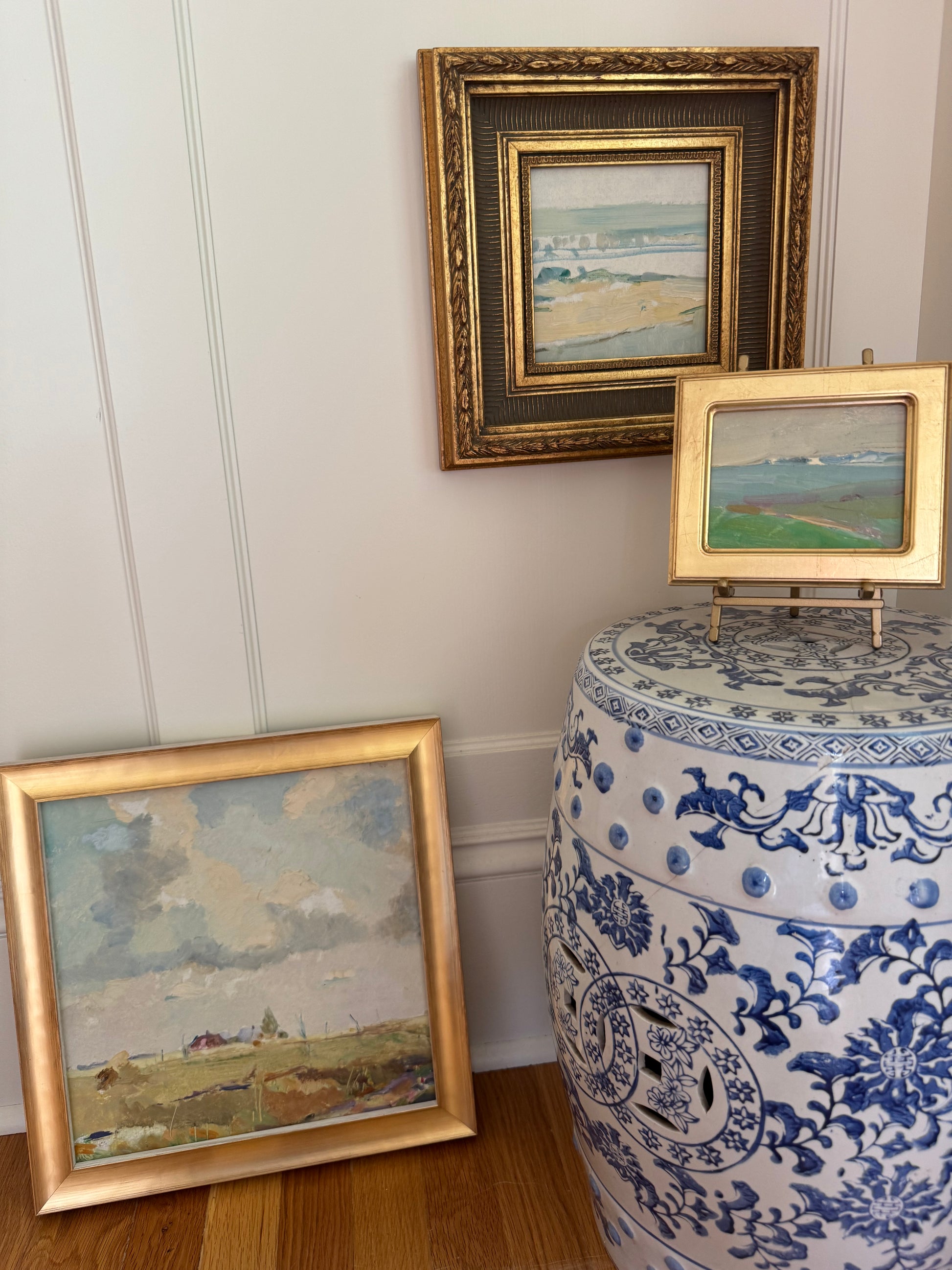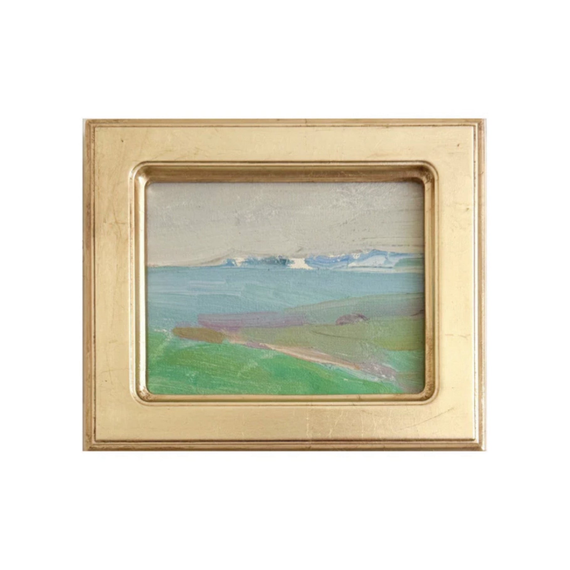 An original miniature oil painting on board. Excellent condition and newly framed in a hand-leafed gold frame. Includes an easel for display. Measures 5 x 6 inches including the frame.