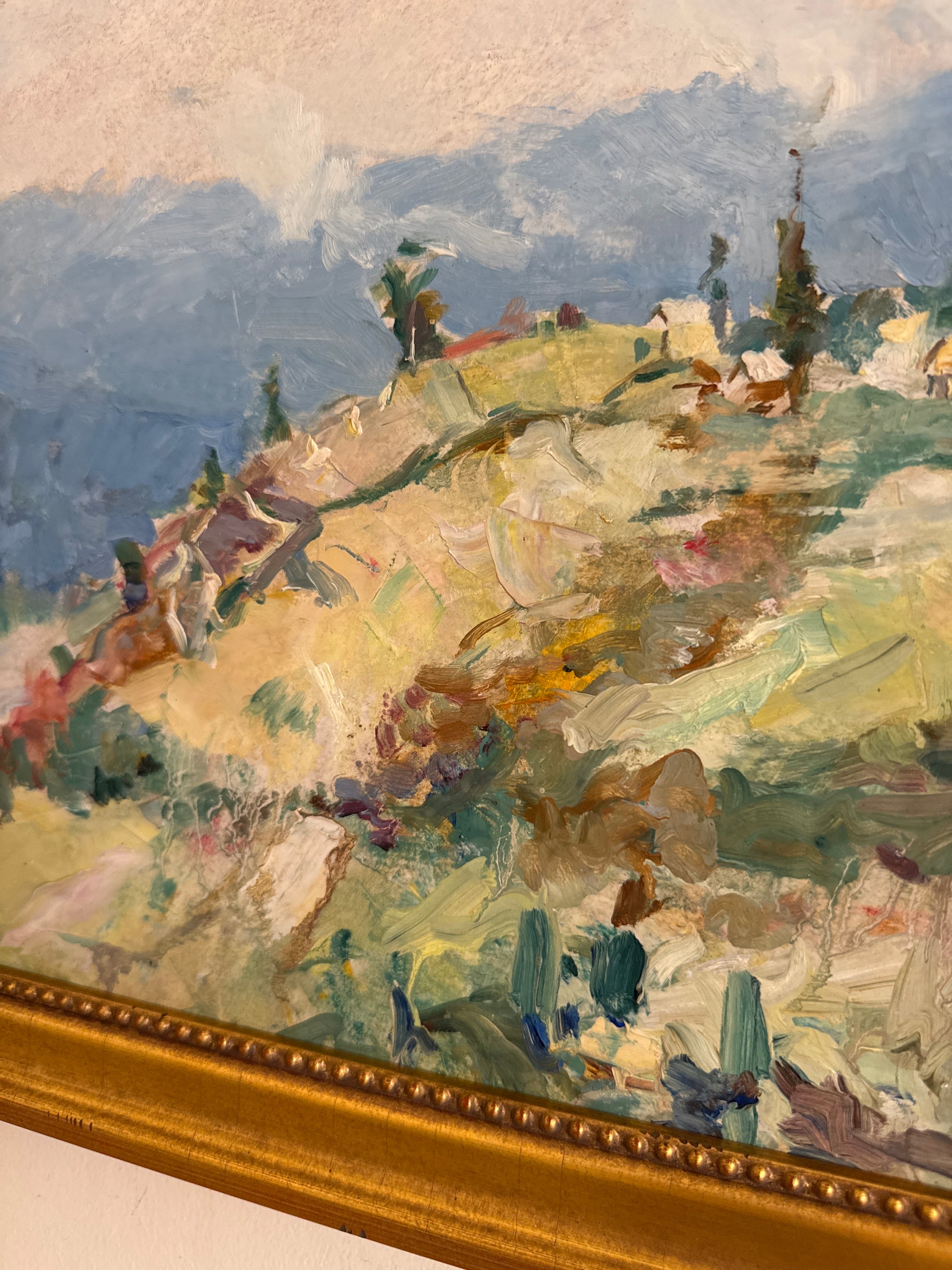 An original vintage oil painting on panel. Excellent condition and newly framed. Measures 15 x 19 inches including the frame.