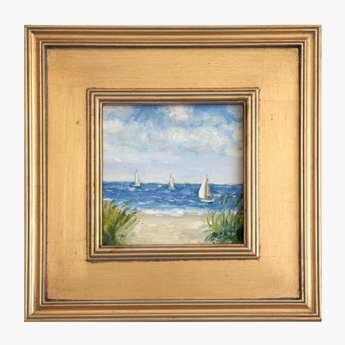 An original oil painting by Azra Iqbal. Signed on the reverse. Excellent condition and newly framed in a gold leaf plein air frame. Measures 11.5 x 11.5 inches including the frame.
