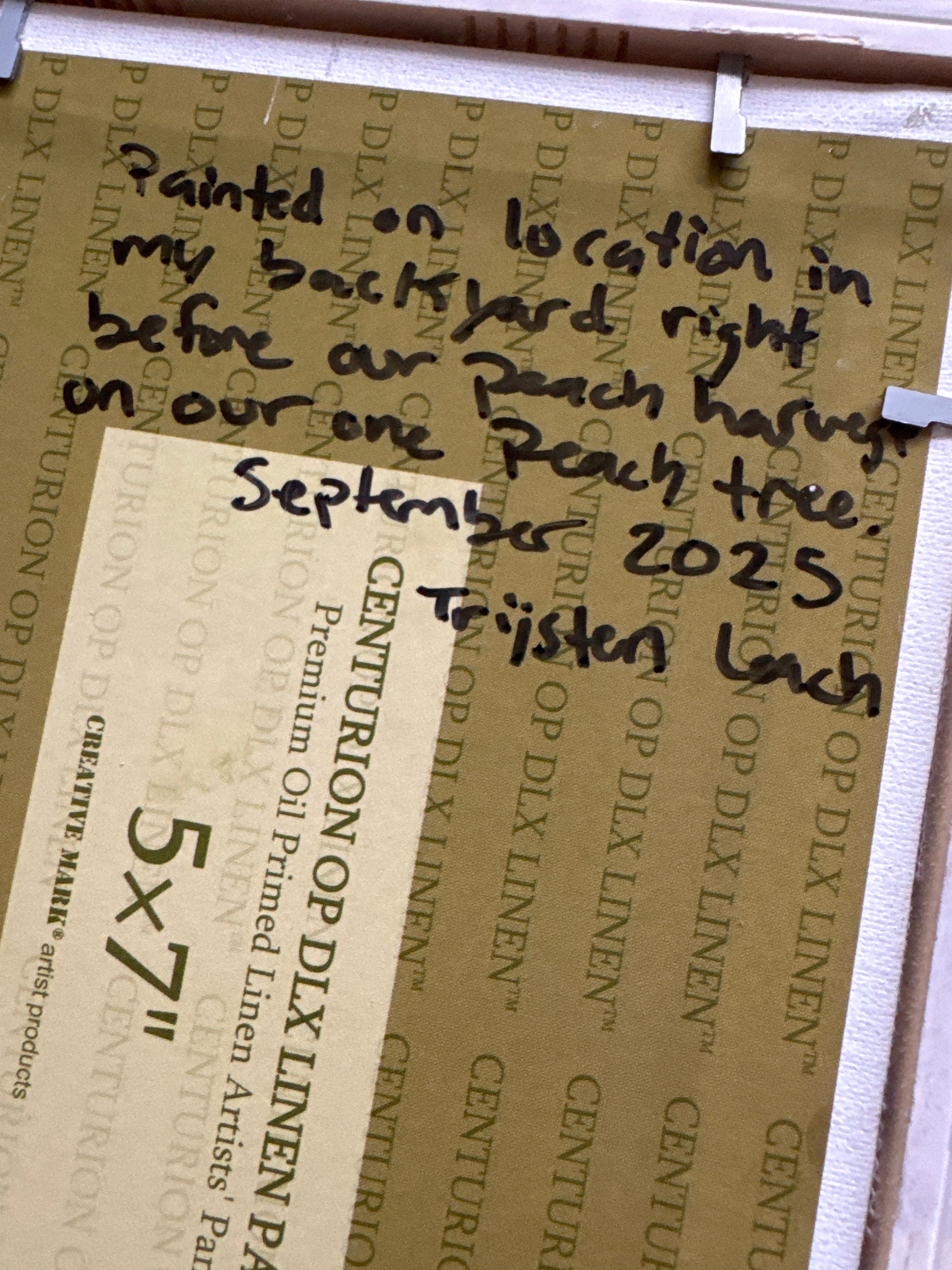 An original oil painting on canvas by Trijsten Leach. Measures 8.5 x 10.5 inches including the frame. Signed in the lower left.