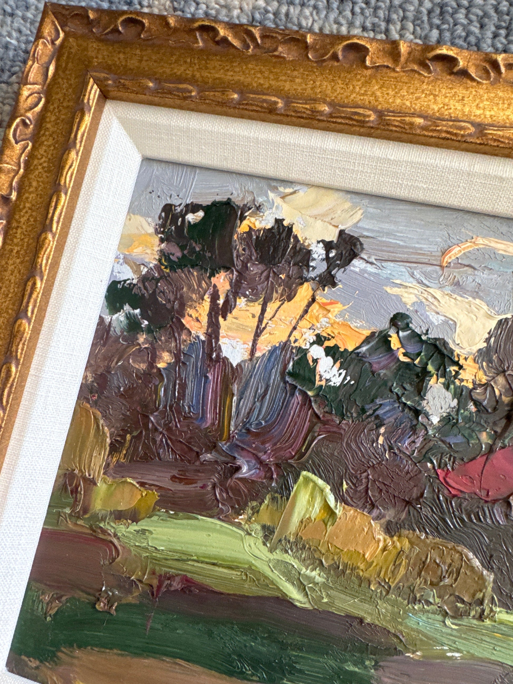 An original vintage landscape painting from the 1950. Excellent condition and newly framed with a narrow, ornate gold frame and linen liner. Measures 11 x 15 inches including the frame. Heavy paint texture creates gorgeous depth and deep color.