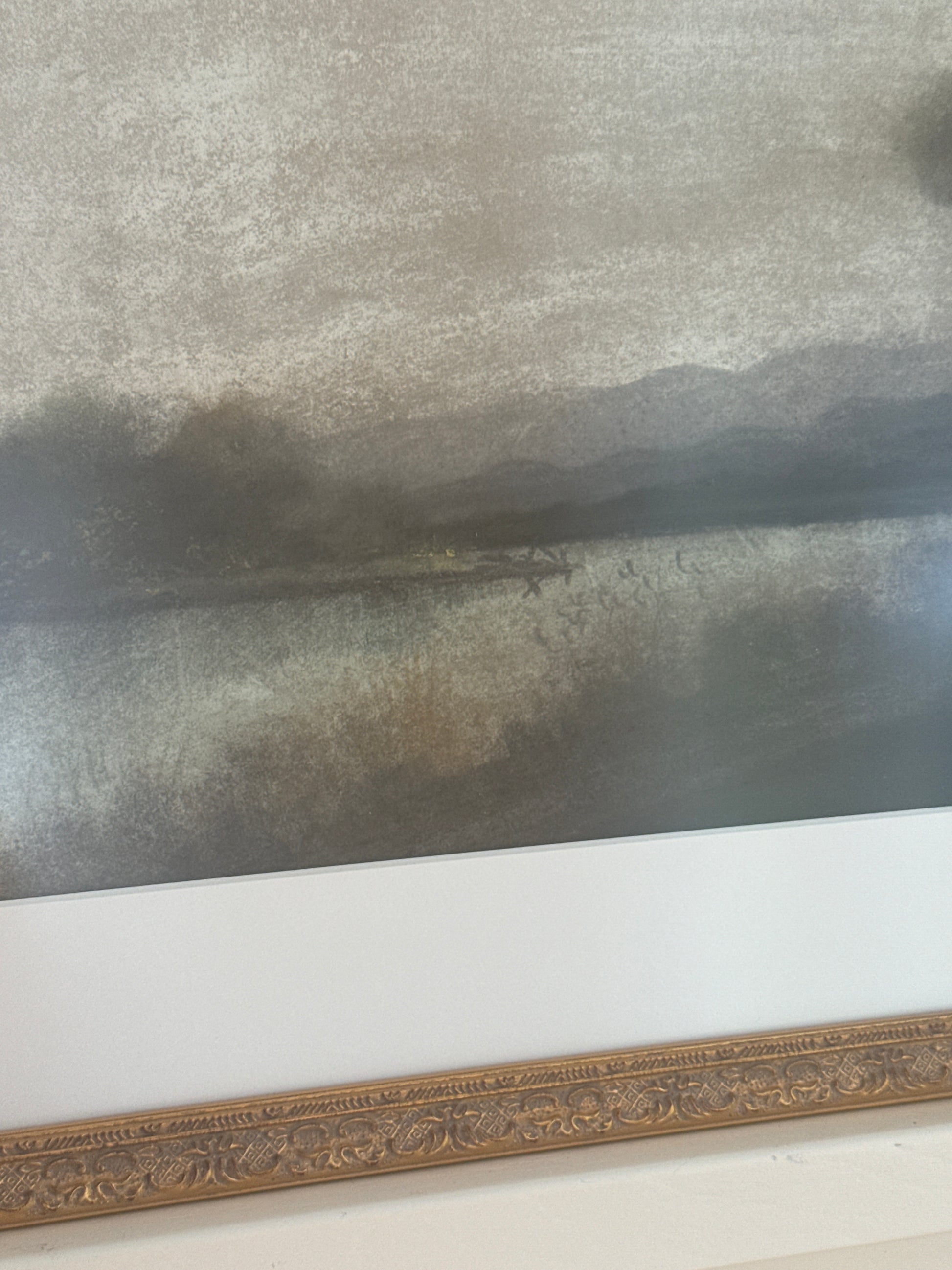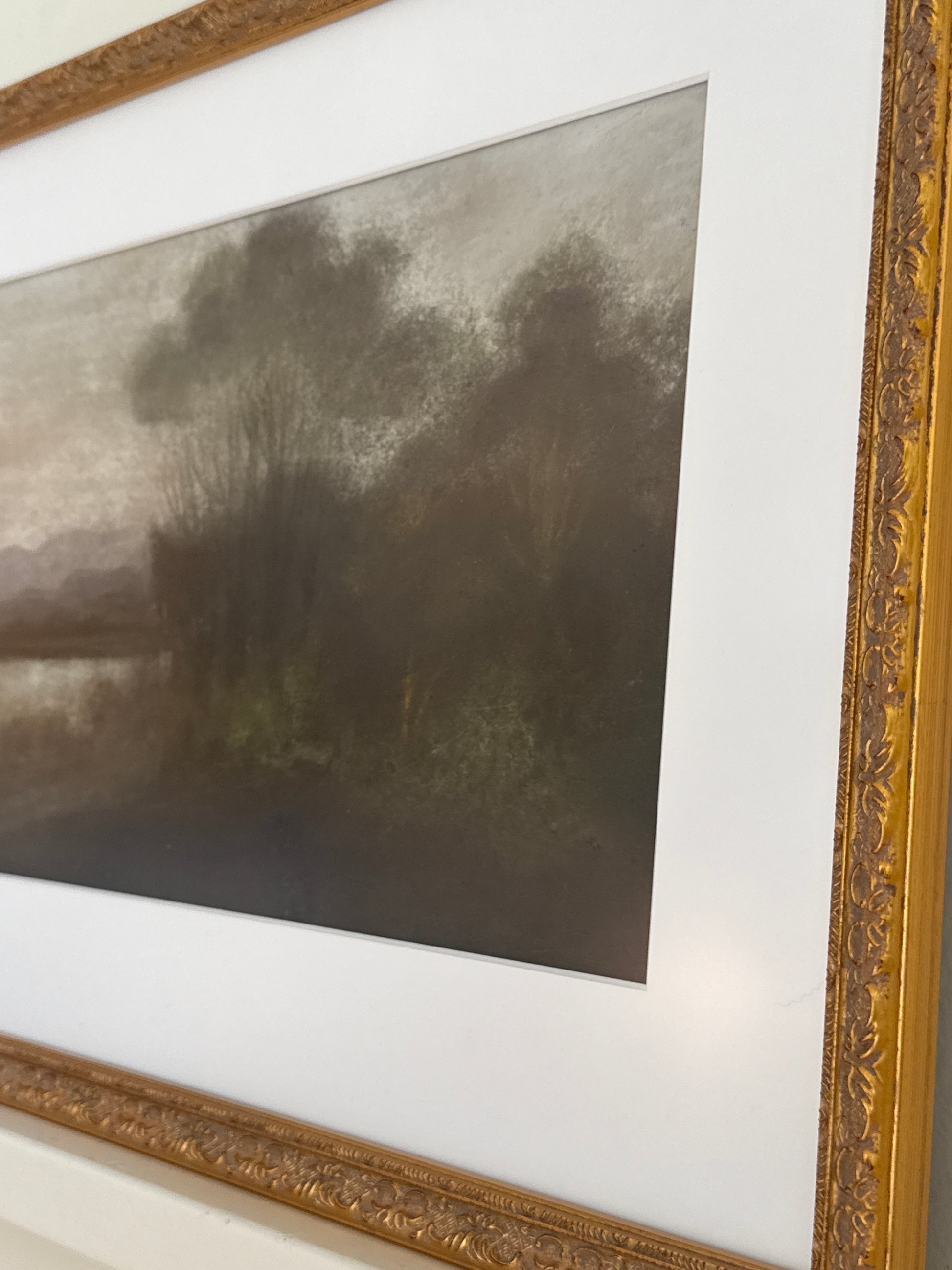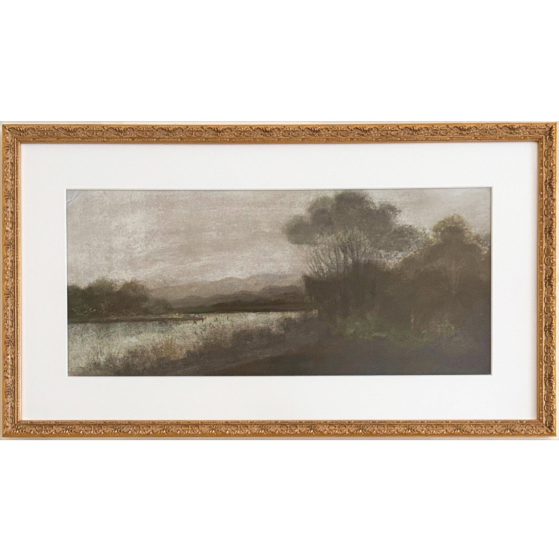 An original vintage pastel drawing. Looks black and white from a distance but actually dark grays, greens, browns and soft black. Newly framed with acid-free matting and reduced-glare/UV protective glass. Measures 15 x 26 inches including the frame.