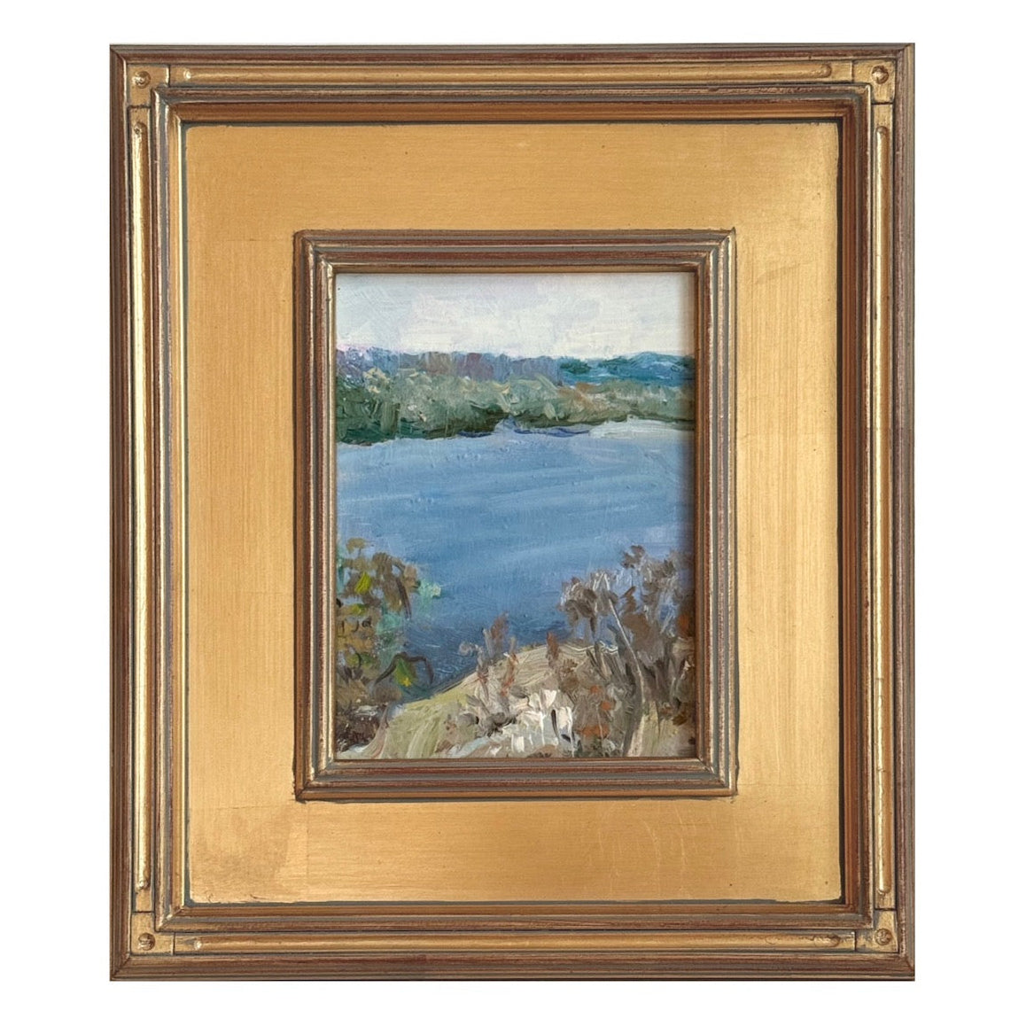 An original vintage oil painting on board. Excellent vintage condition and newly framed in a gold leaf plein air frame with corner details. Measures 13 x 15 inches including the frame.