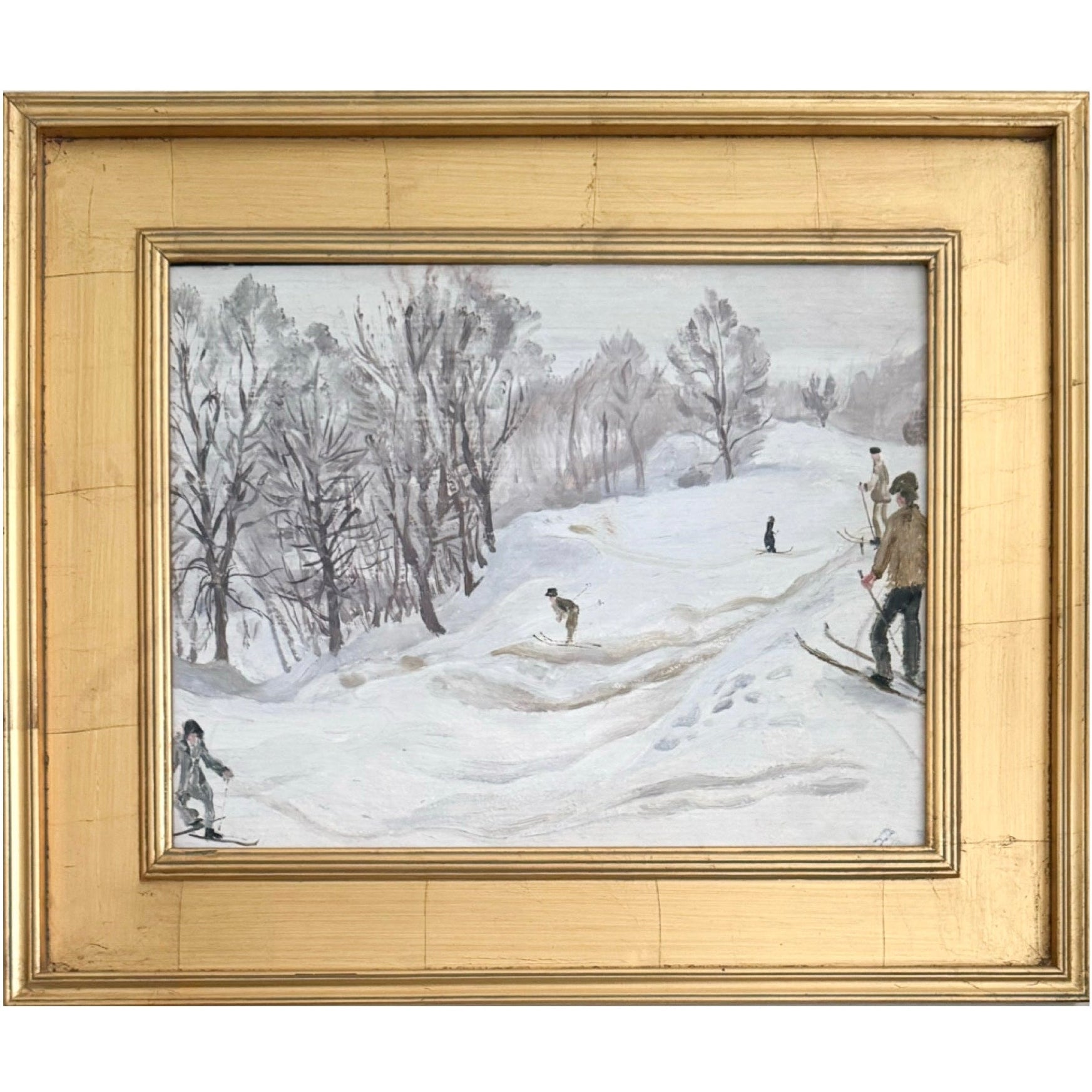 An original vintage oil painting on panel. Excellent vintage condition and signed on the reverse. Circa 1980. Newly framed in a plein air gold leaf frame. Measures 21 x 25 inches including the frame.