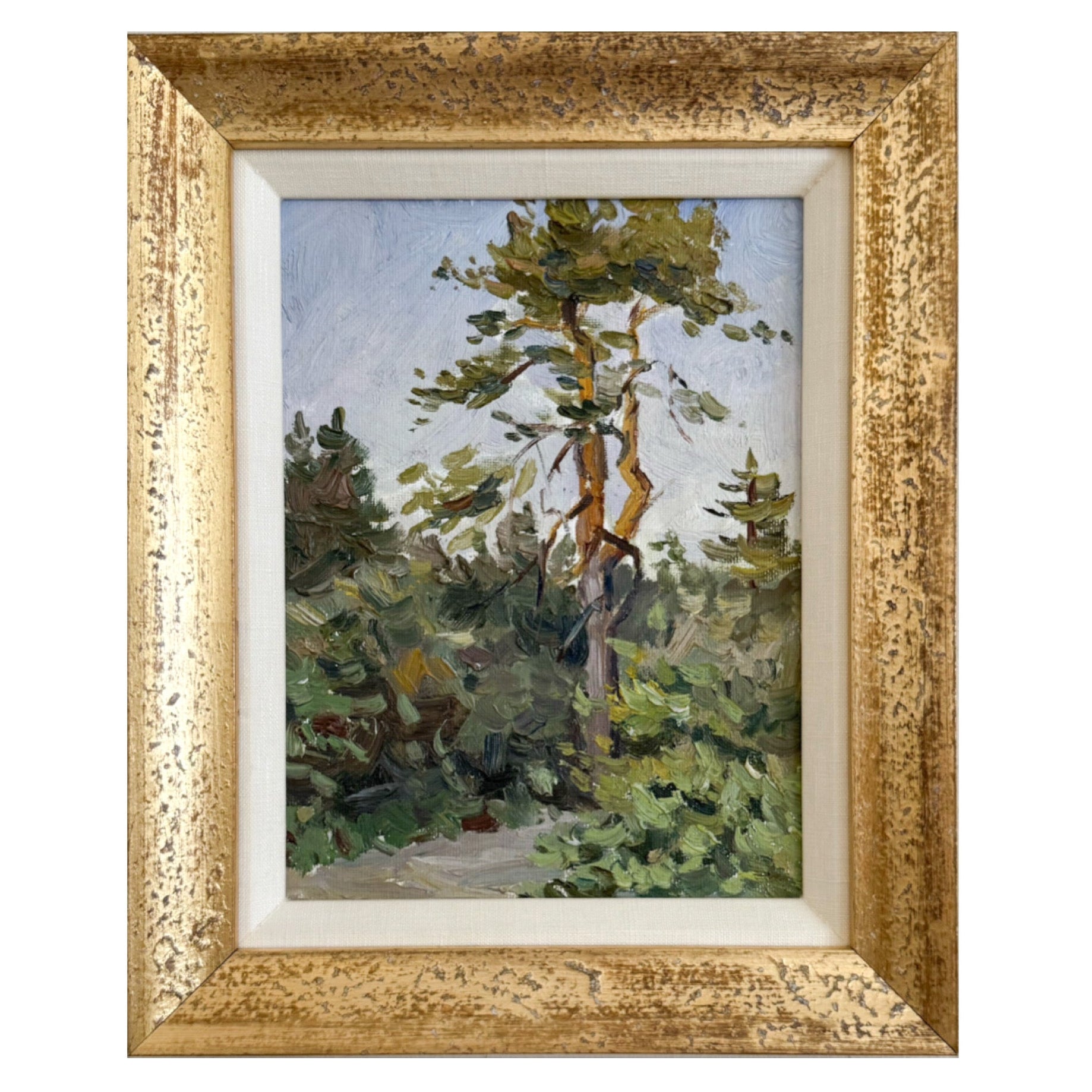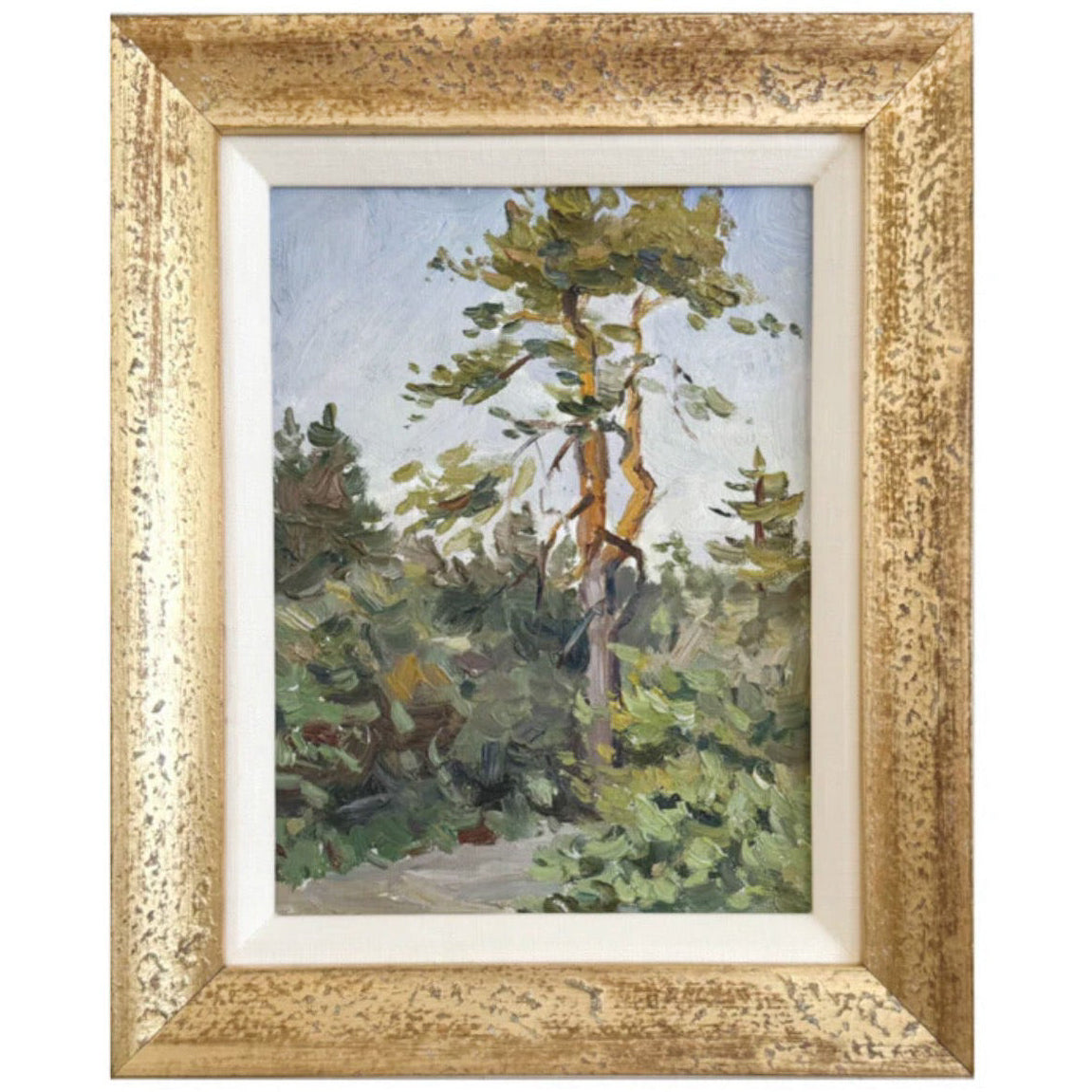 An original vintage oil painting on panel. Excellent condition from the 1970s. Beautiful texture and depth. Newly framed with an antiqued gold leaf frame and linen liner. Measures 10 x 12.5 inches including the frame.