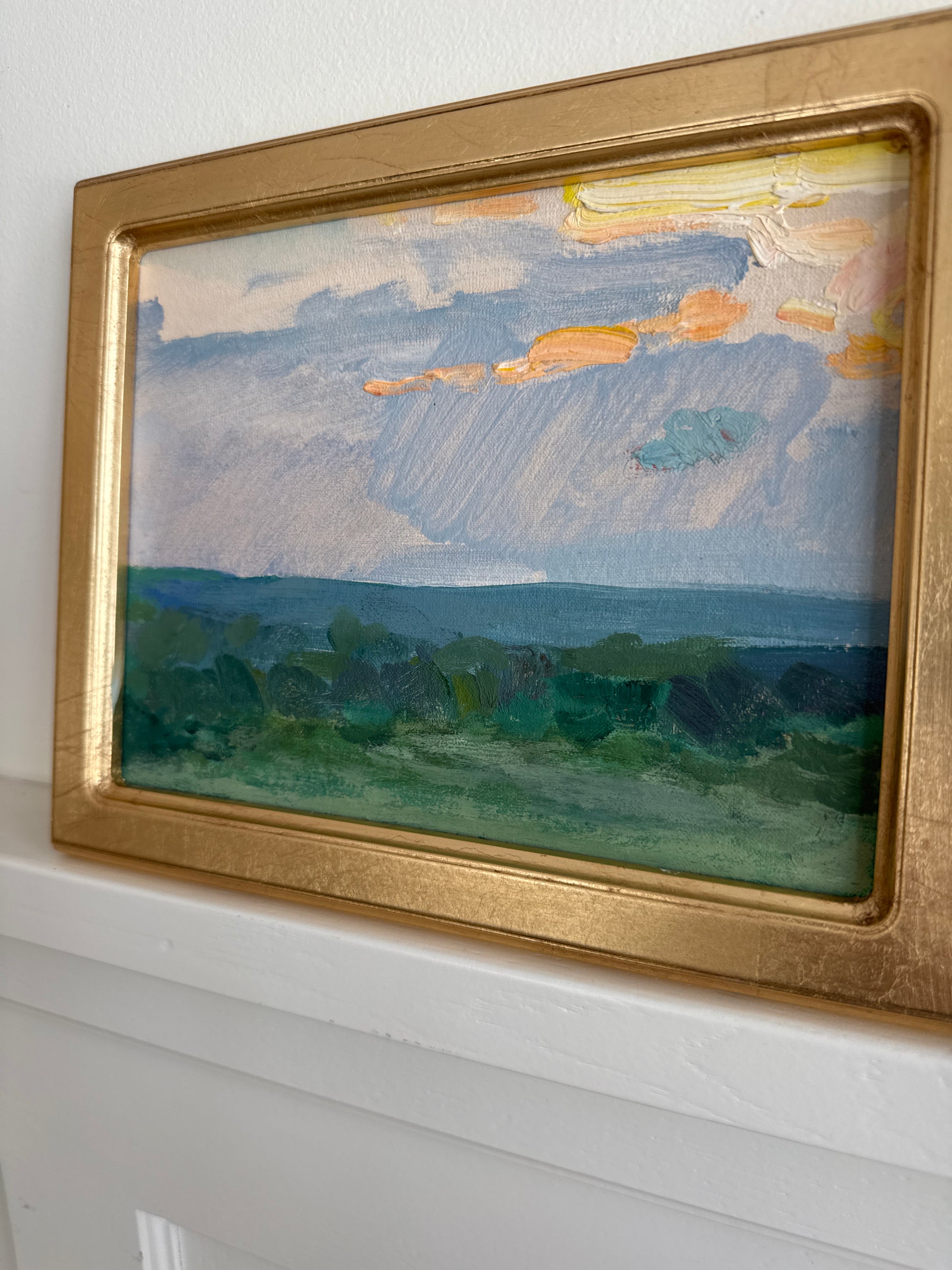 An original vintage oil painting on board. Excellent condition and newly framed in a narrow gold leaf frame. Measures 8 x 10 inches including the frame.