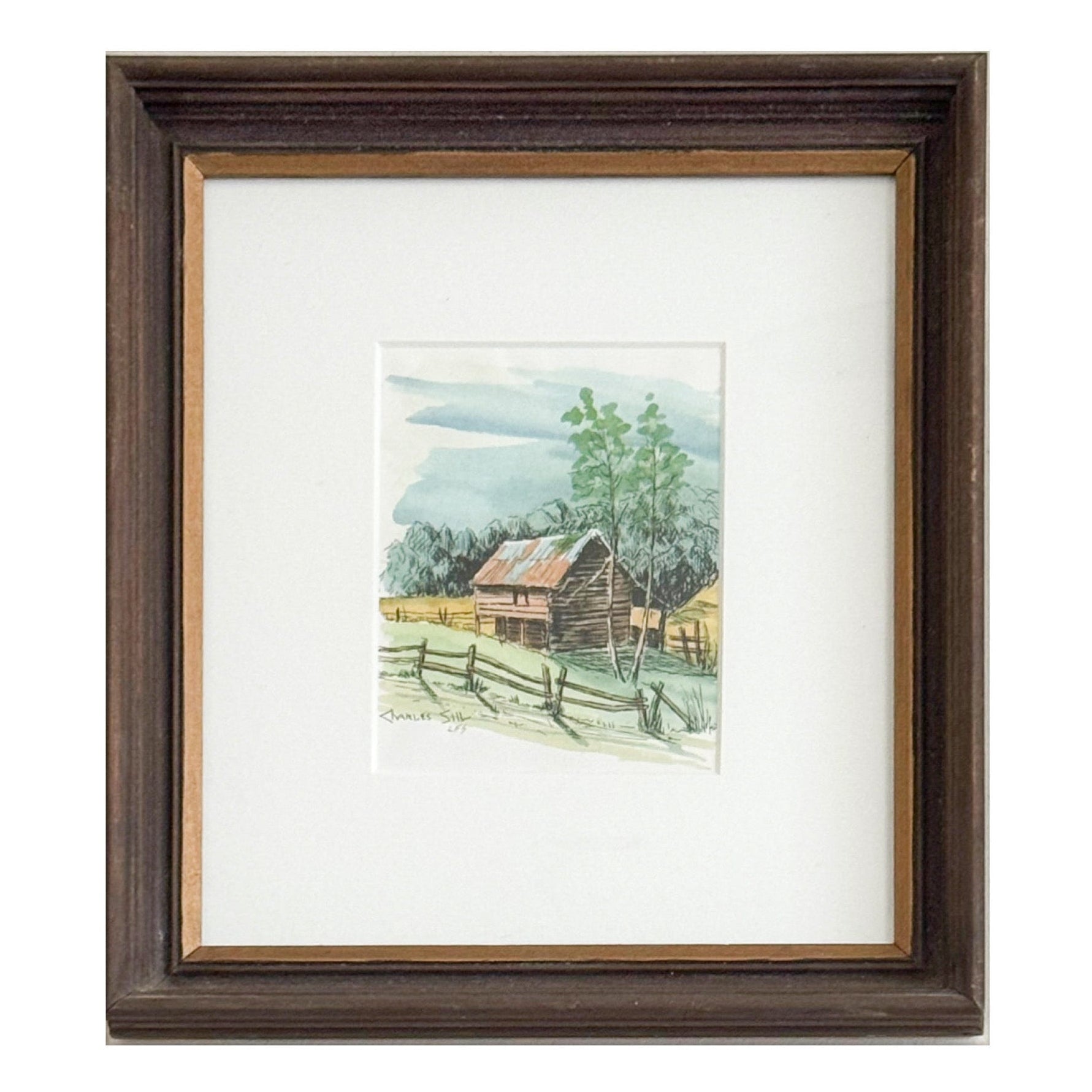 An original mixed media piece, signed in the lower left. Pen & ink with watercolor. Excellent vintage condition and newly framed & matted with UV protective glass. Frame is wood with a gold bevel. Measures 9.5 x 10.5 inches including the frame.
