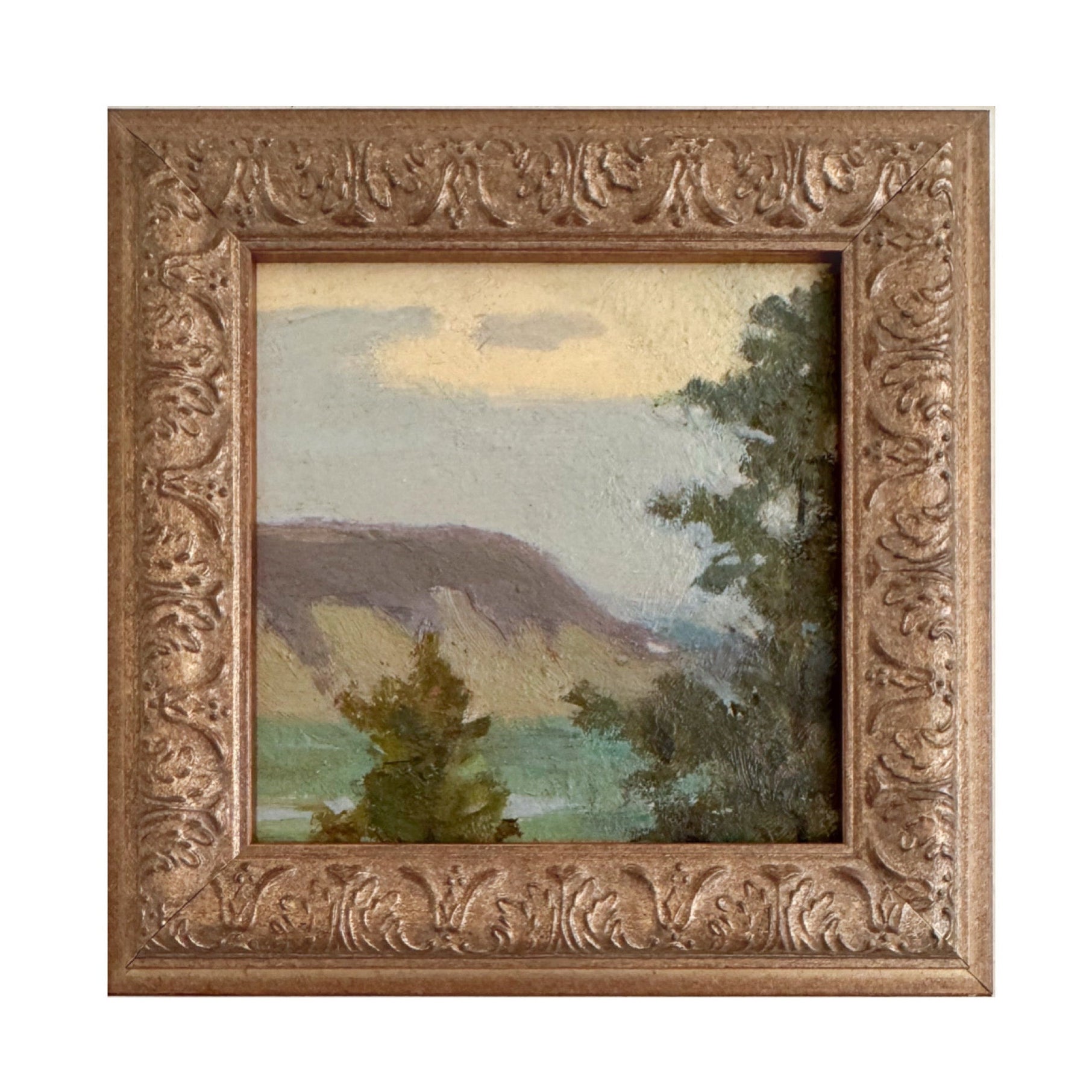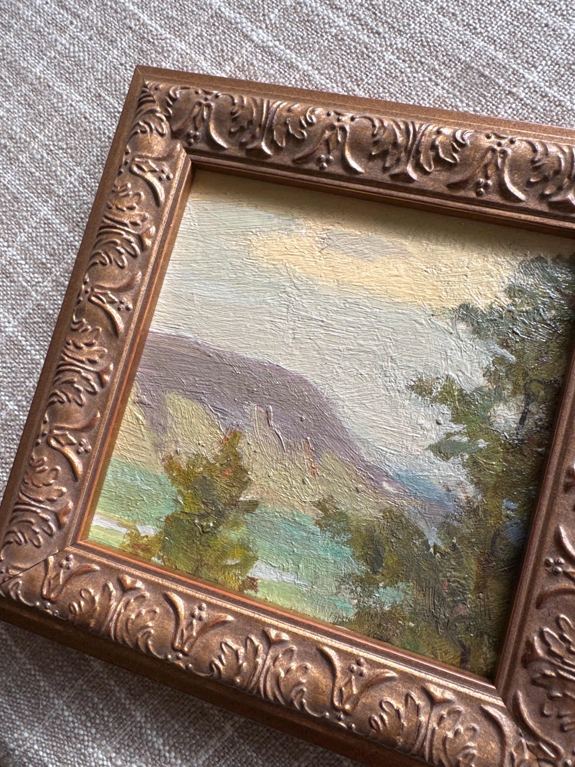 An original vintage oil painting on board. Excellent condition and newly framed. Includes an easel for display. Measures 7 x 7 inches including the frame.