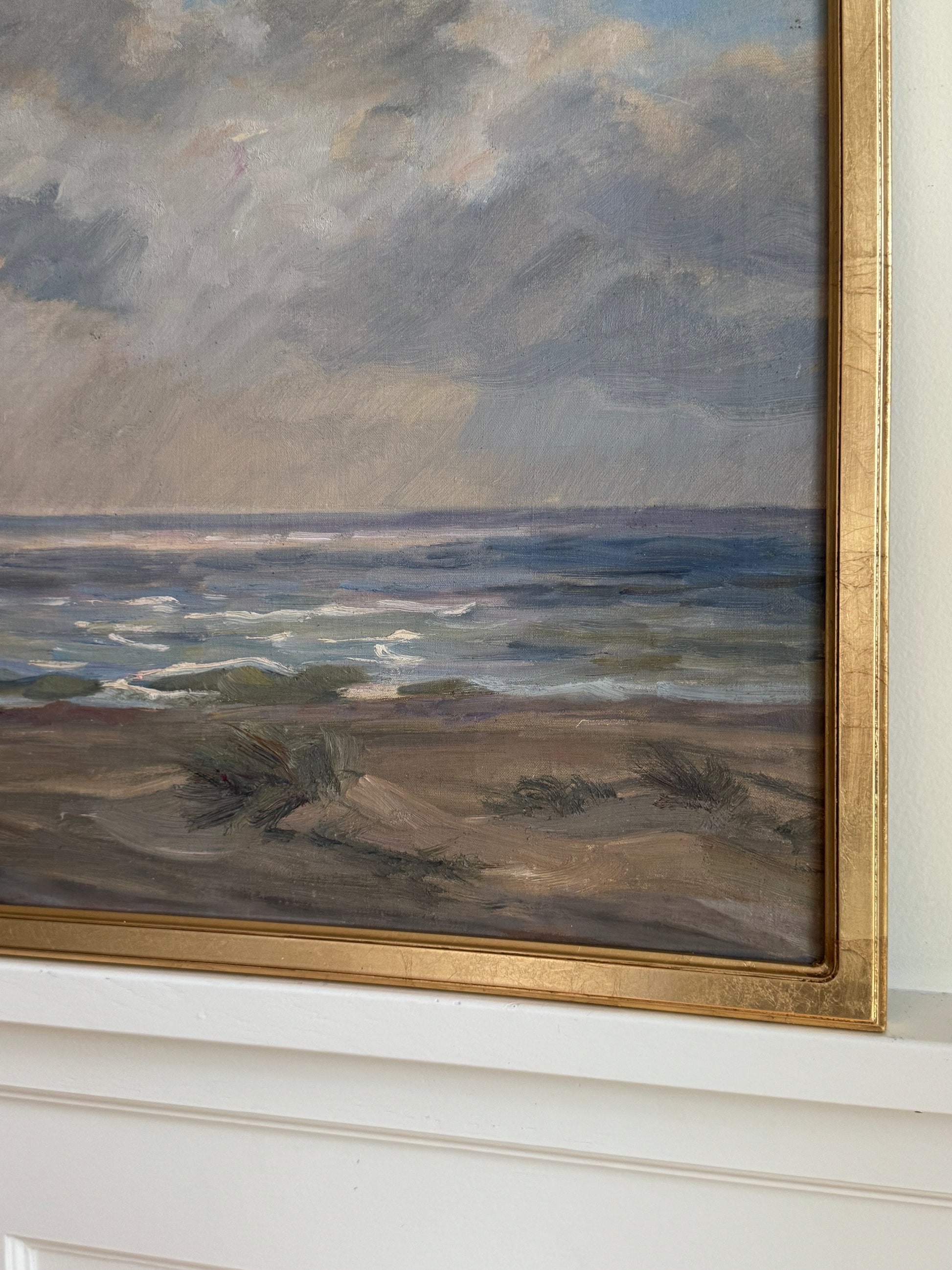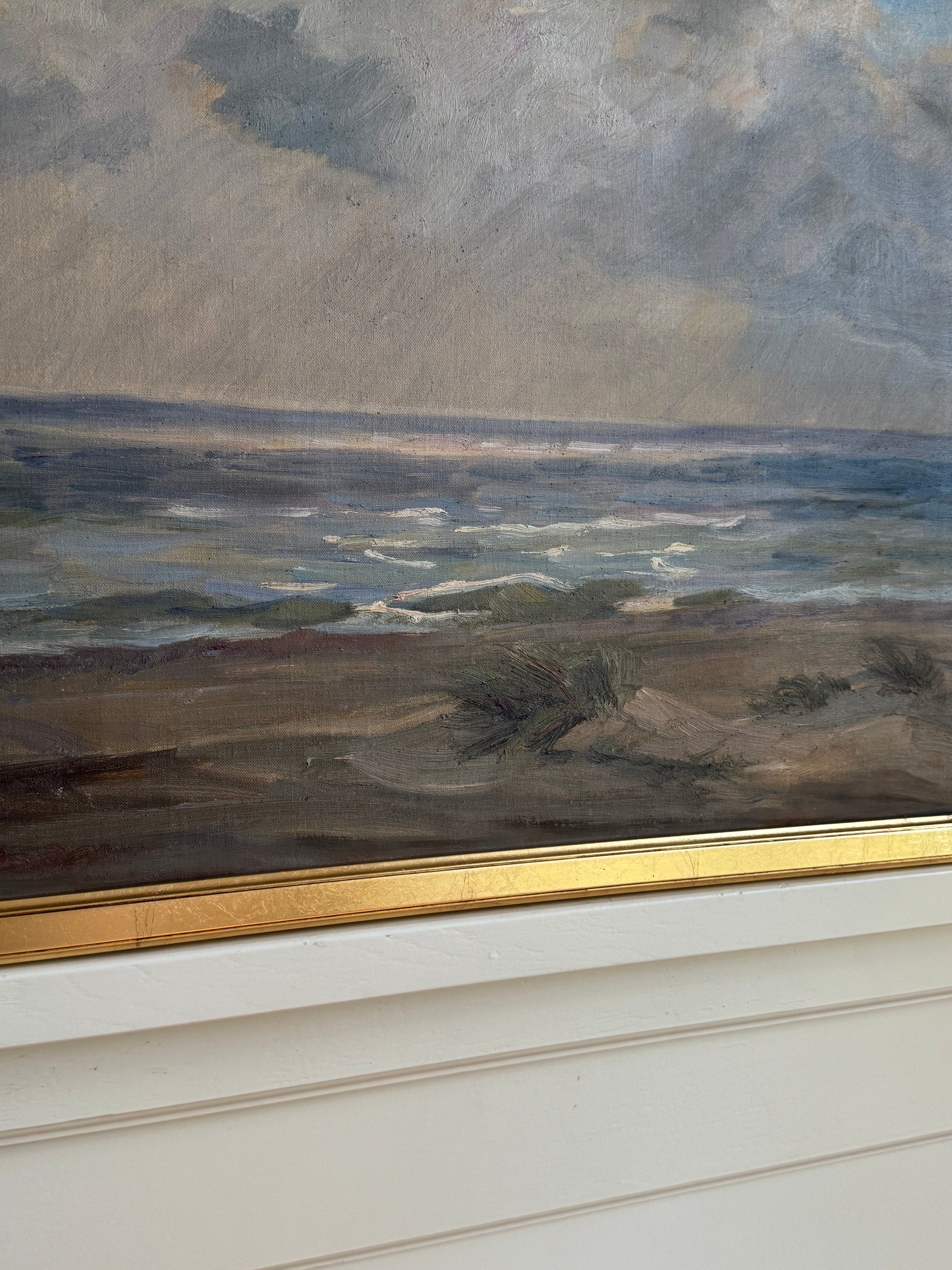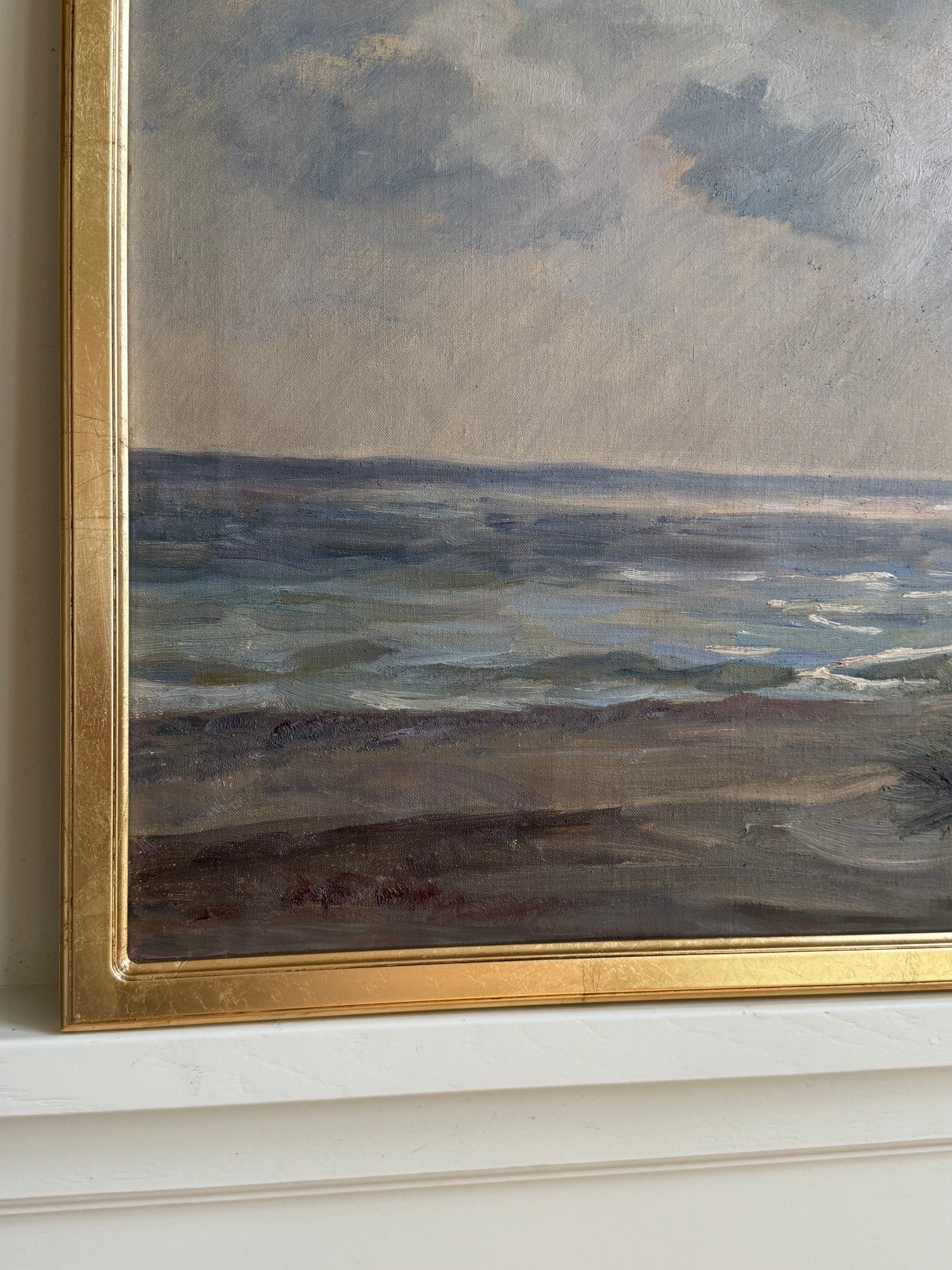 An original vintage oil painting on canvas from the 1950s. Excellent vintage condition. A soft, moody seascape painting. Newly framed in a narrow, custom gold leaf frame. Measures 20 x 26 inches including the frame.