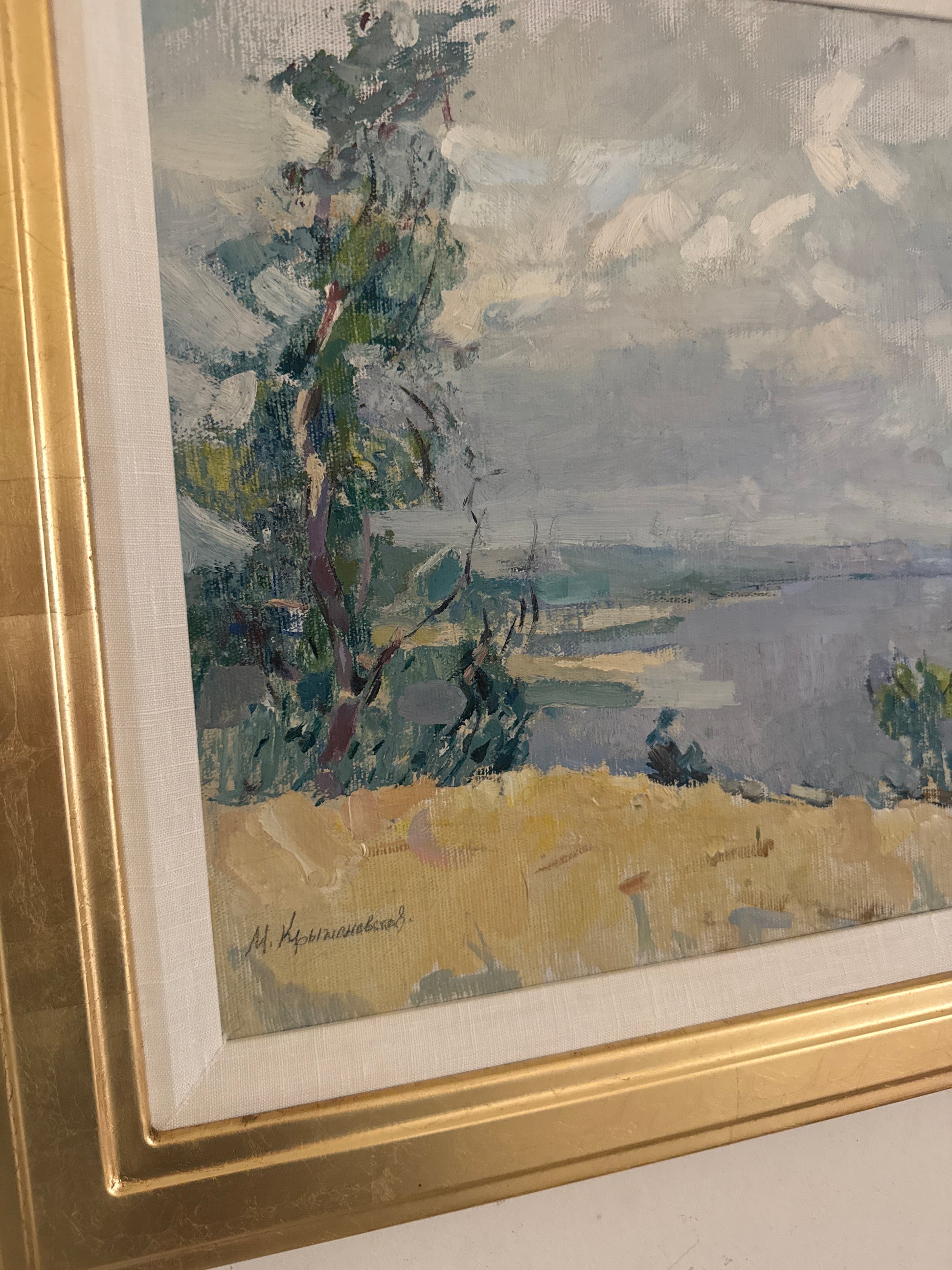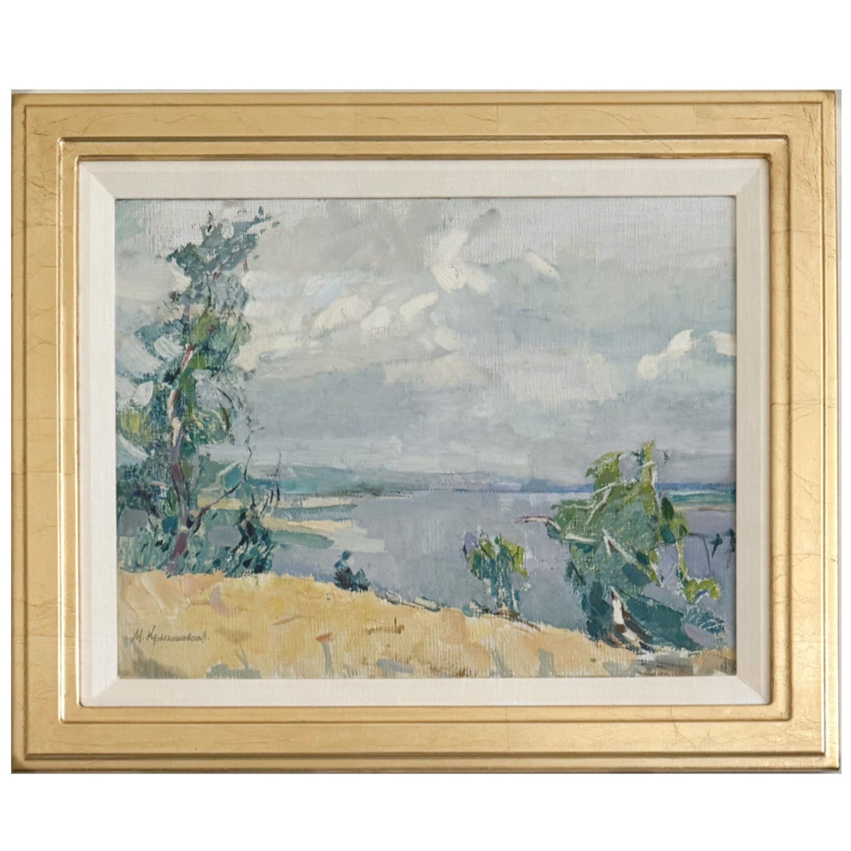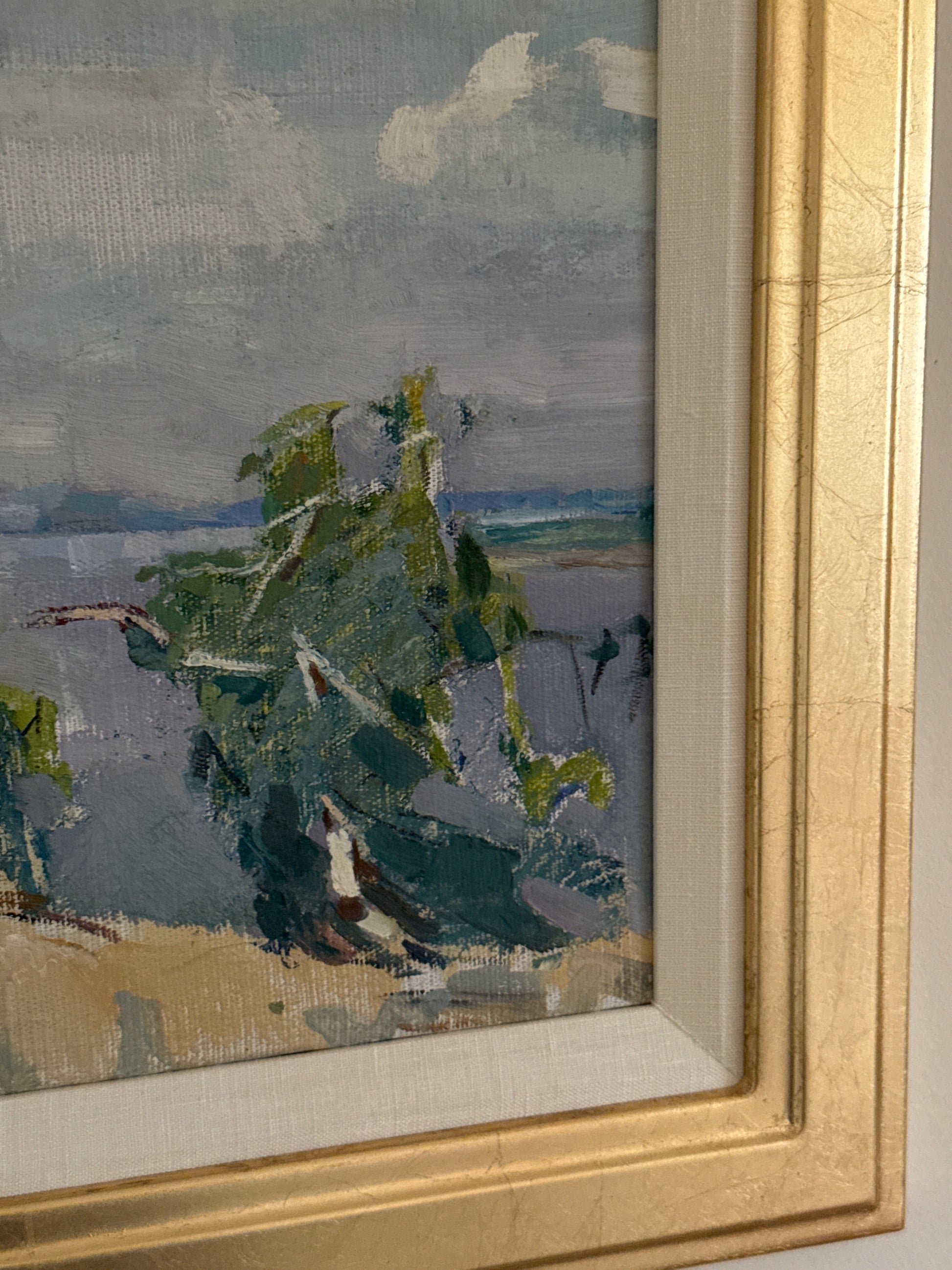 A large original oil painting on canvas board. Measures 19 x 23 inches including the frame. Signed in the lower left. Excellent vintage condition. Newly framed in a custom gold leaf frame with a linen liner.