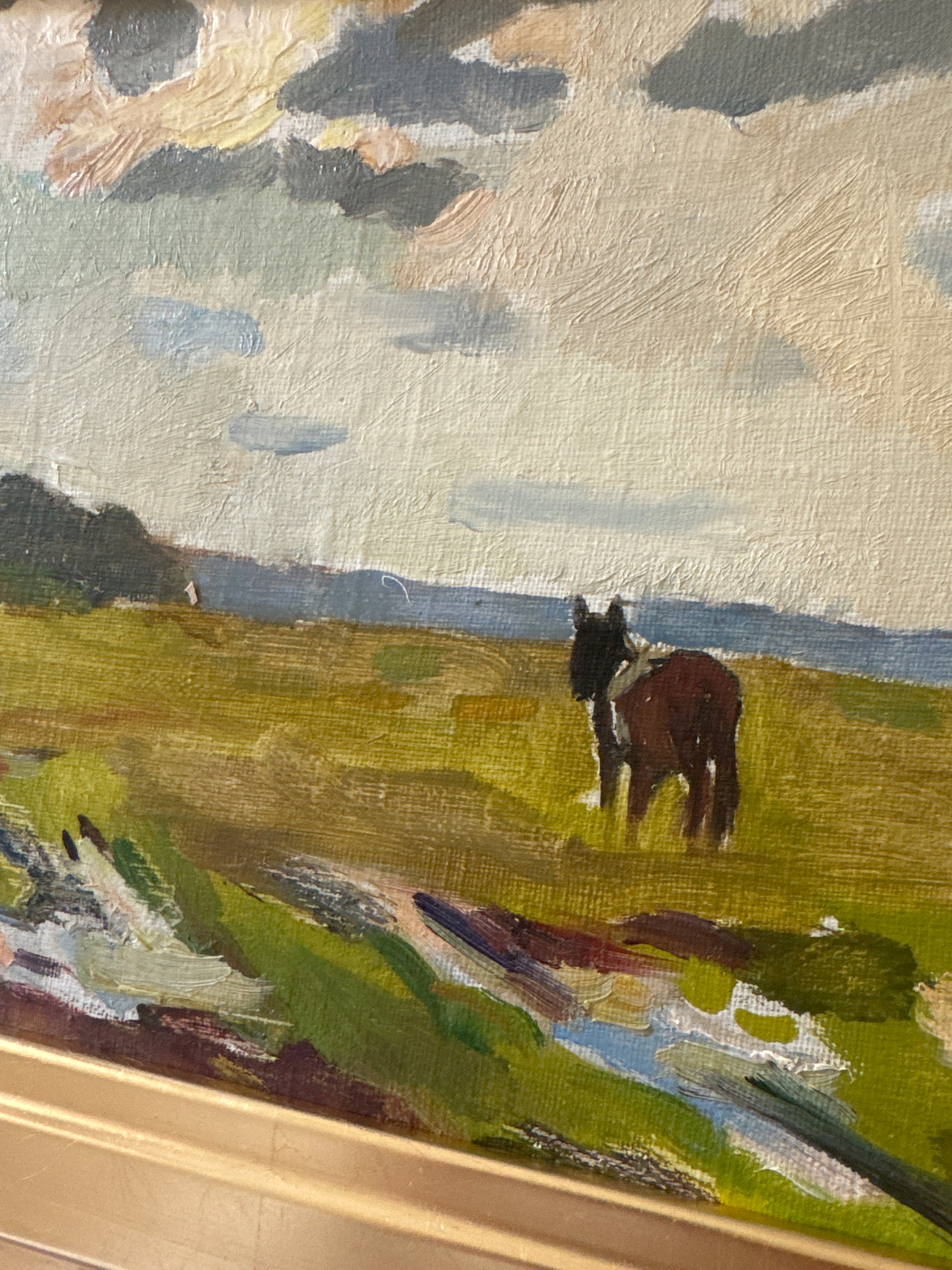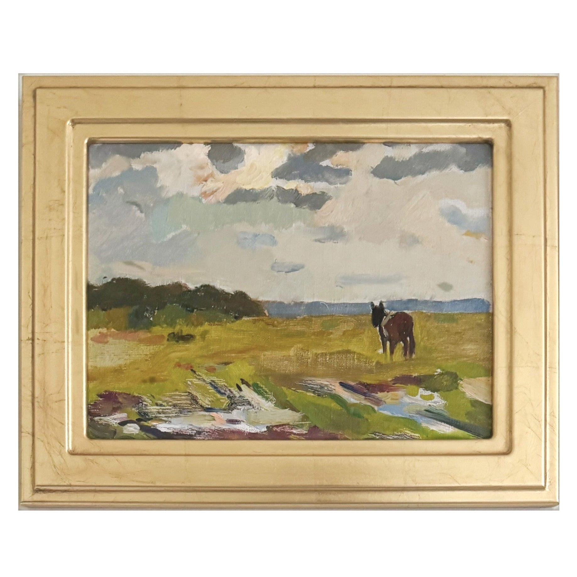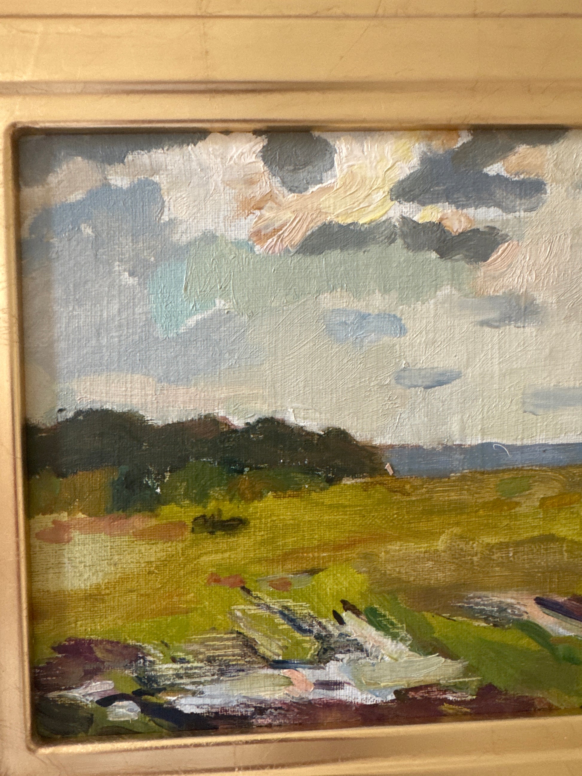 An original vintage oil painting on board. Excellent condition and newly framed in a custom gold leaf frame. Measures 12 x 15 inches including the frame.